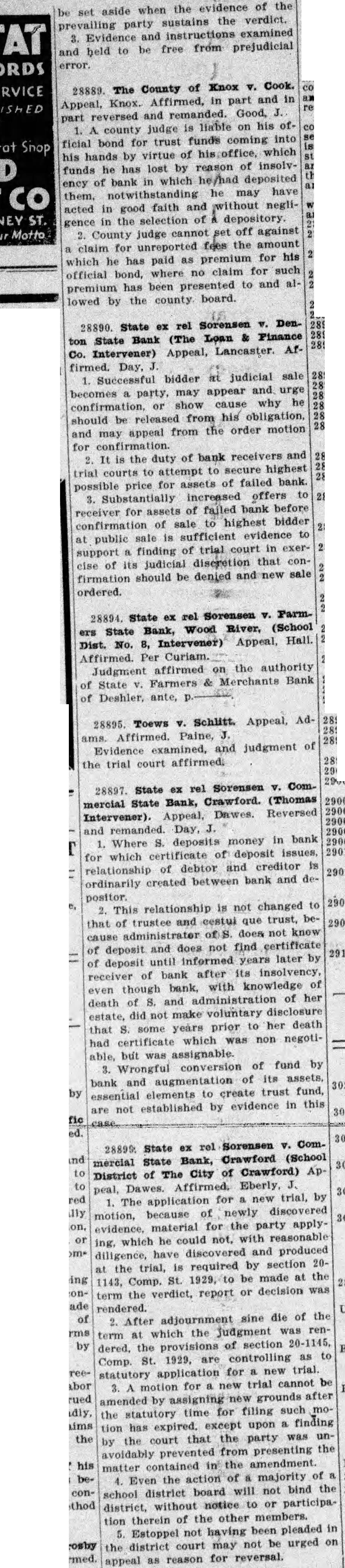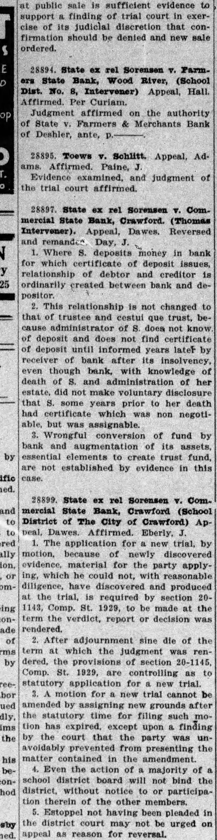 An agreement for the immediate cancelation of a fire insurance policy, without giving five days' notice, can be made, and this can be shown by acts and conduct as well as by direct words. 2. Acquiescence in a cancelation notice will operate to cancel a fire insurance policy and will work an estoppel to assert that the policy is still in force. 28881 Dworak V. Shire. Appeal, Lancaster. Affirmed. Goss, C. J. 1. In law action. where the evidence is in substantial conflict, the decision of fact is for the jury. 2. A judgment on a verdict will not be set aside when the evidence of the prevailing party sustains the verdiet. Evidence and instructions ex. amined and HELD to be free from prejudicial error. 28889 The County of Knox Cook. Appeal, Knox. Affirmed in part and in *part reversed and remanded. Good, J. 1. A county judge is liable on his official bond for trust funds coming into his hands by virtue of his office, which funds he has lost by reason of insolvency of bank in which he had deposited them, notwithstanding he may have acted in good and without depository. negligence in the selection of a 2. County judge cannot set off against a claim for unreported fees the amount which he has paid as premium for his official bond, where no claim for such premium has been presented board. to and allowed by the county 28890 State ex rel Sorensen Denton State Bank (The Loan & Finance Co., Intervener). Appeal, Lancaster. Affirmed. Day, J. 1. Successful bidder at judicial sale becomes a party, may appear and urge confirmation, or show cause why he should be released from his obligation, and may appeal from the order upon motion for confirmation. 2. It is the duty of bank receivers and trial courts to attempt to secure highest possible price for assets of failed bank. 3. Substantially increased offers to receiver for assets of failed bank before confirmation of sale to highest bidder at public sale is sufficient evidence to support a finding of trial court in exercise of its judicial discretion that confirmation should be demed and new sale ordered. 28894 State rel Sorensen V. Farmers State Bank, Wood River, (School Dist. No. 8, Intervener). Appeal, Hall. Affirmed. Per Curiam. Judgment affirmed on the au.hority of State V. Farmers & Merchants Bank of Deshler, 3 SCJ, No 23, P 28895 Toews Schlitt. Appeal, Adams. Affirmed. Paine, J. Evidence examined, and judgment of the trial court affirmed. 28897 State ex rel Soren V. Commercial State Bank, Crawford. (Thomas, Intervener.) Appeal, Dawes. Reversed and remanded. Day, J. 1. Where S. deposits money in bank for which certificate of deposit issues, relationship of debtor and creditor is ordinarily created between bank and depositor. 2. This relationship is not changed to that of trustee and CESTUI QUE TRUST, because administrator of S. does not know of deposit and does not find certificate of deposit until informed years later by receiver of bank after its insolvency, even though bank, with knowledge of death of S. and administration of her estate, did not make voluntary disclosure that some years prior to her death had certificate which was non negotiable, but was assignable. 3. Wrongful conversion of fund by bank and augmentation of its assets essential elements to create trust fund, are not established by evidence in this case. 28899 State ex rel Sorensen Commercial State Bank Crawford (School District of The City of Crawford). Appeal, Dawes: Affirmed. Eberly, J. 1. The application for a new trial, by motion, because of newly discovered evidence, material for the party applying, which he could not, with reasonable diligence, have discov and produced at the trial, is required by section Comp. St. 1929, to Le made at the term the verdict, report or decision was rendered. 2. After adjournment SINE DIE of the term at which the judgment was rendered, the provisions of section 20-1145, Comp. St. 1929, are confor trolling as to statutory applicat on a new trial. 3. A motion for a new trial cannot be amended by assigning new grounds after the statutory time for fil ng such motion has expired, except upon a finding by the court that the party was unavoidably prevented from preamendment. senting the matter contained in the 4. Even the action of a majority of a school district board will not the district, without notice to or parbers. ticipation therein of the other mem5. Estoppel not having been pleaded in the district court may not be urged versal. on appeal as reason for re-