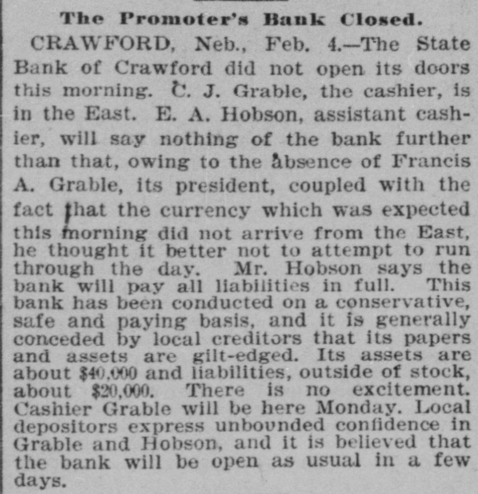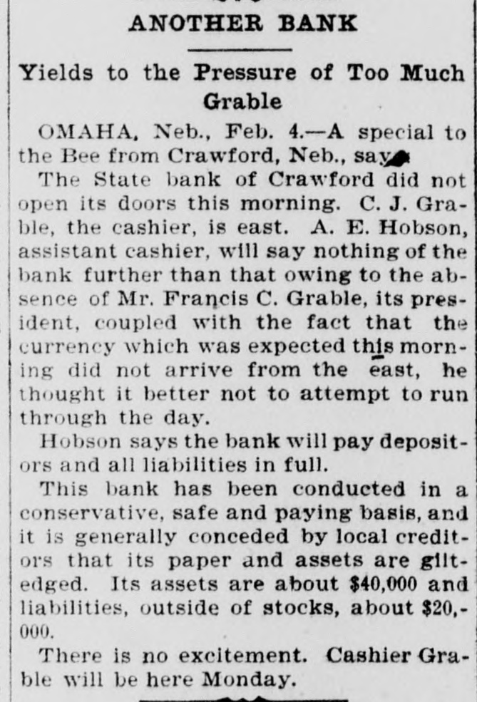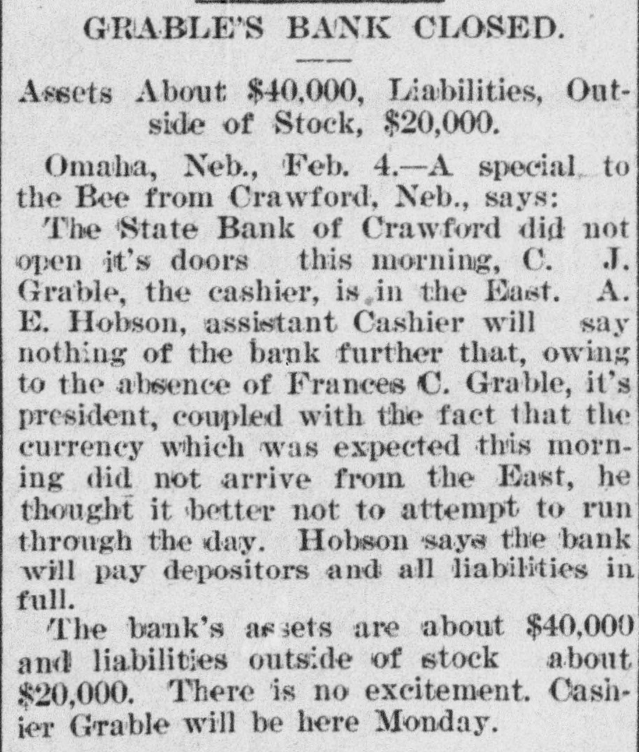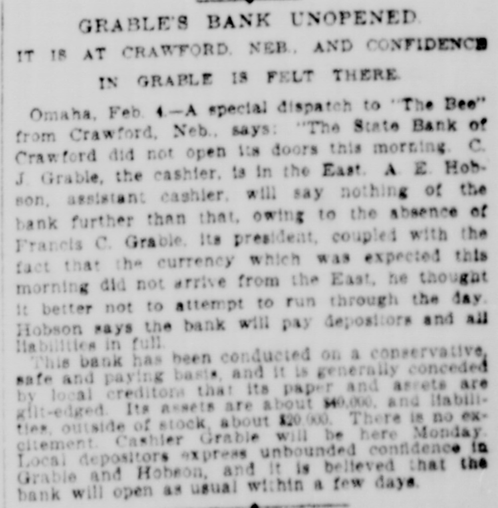 GRABLE'S BANK UNOPENED IT 18 AT CRAWFORD NEB. AND CONFIDENCE IN GRABLE 18 FELT THERE Omaha, Feb 4-A special dispatch to The Bee" from Crawford, Neb. says: "The State Bank of Crawford did not open its doors this morning C. J. Grable, the cashier. is in the East. A E Hobson, assistant cashier. will say nothing of the bank further than that owing to the absence of Francis C. Grable its president, coupled with the fact that the currency which was expected this morning did not arrive from the East. he thought It better not to attempt to run through the day Hobson says the bank will pay depositors and all liabilities in full This bank has been conducted on a conservative, safe and paying basis, and It is generally conceded by local creditors that its paper and assets are gilt-edged Its assets are about $40,000. and liabilities. outside of stock about $20.000 There is no excitement Cashier Grable will be here Monday Local depositors express unbounded confidence in Grable and Hobeon, and It is believed that the bank will open as usual within a few days.