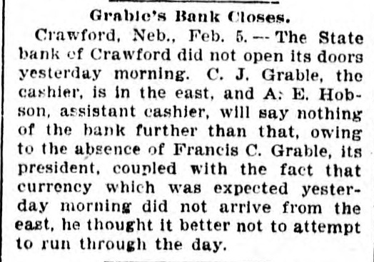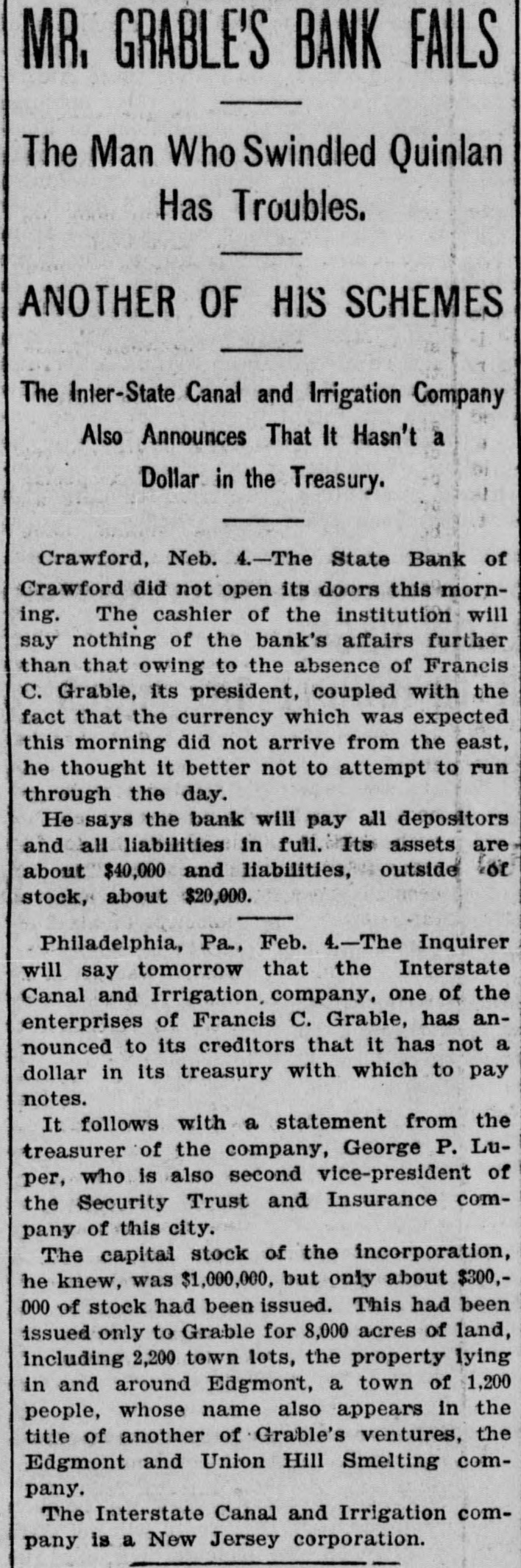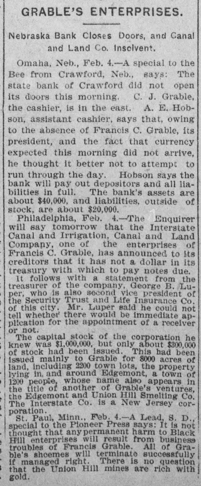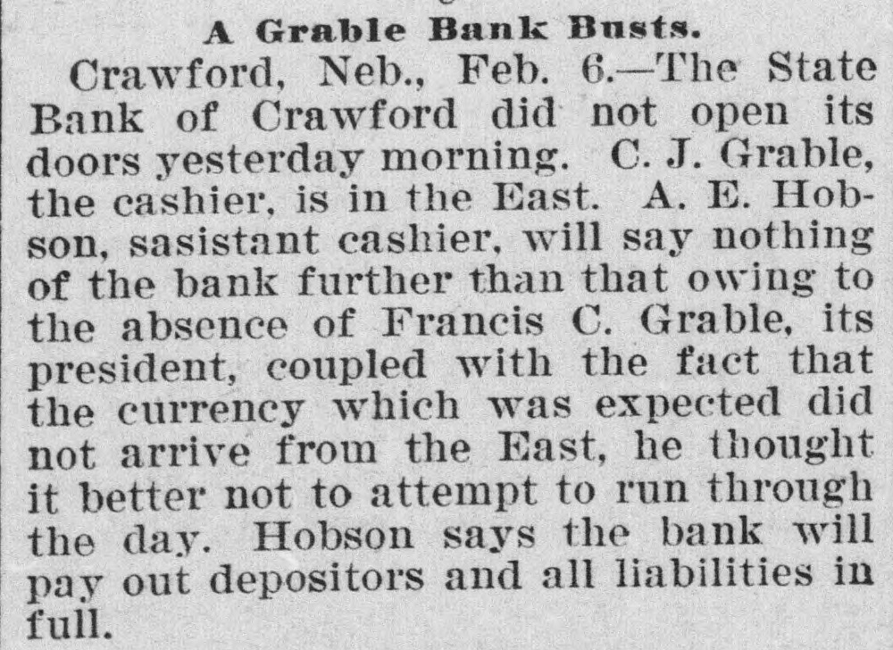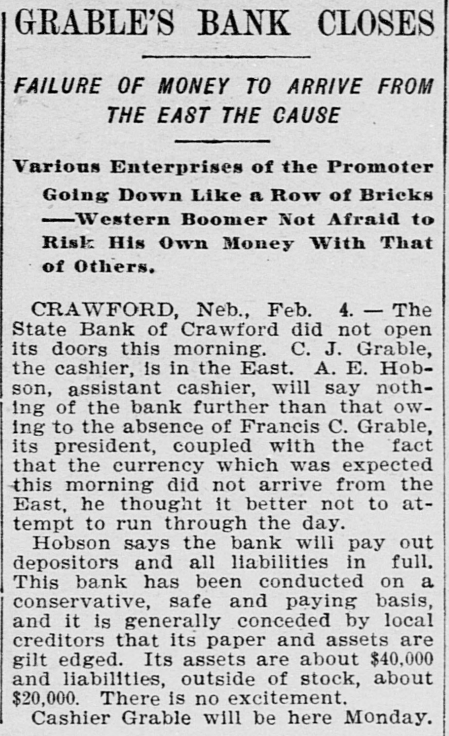 GRABLE'S BANK UNOPENED IT 18 AT CRAWFORD NEB. AND CONFIDENCE IN GRABLE 18 FELT THERE Omaha, Feb 4-A special dispatch to The Bee" from Crawford, Neb. says: "The State Bank of Crawford did not open its doors this morning C. J. Grable, the cashier. is in the East. A E Hobson, assistant cashier. will say nothing of the bank further than that owing to the absence of Francis C. Grable its president, coupled with the fact that the currency which was expected this morning did not arrive from the East. he thought It better not to attempt to run through the day Hobson says the bank will pay depositors and all liabilities in full This bank has been conducted on a conservative, safe and paying basis, and It is generally conceded by local creditors that its paper and assets are gilt-edged Its assets are about $40,000. and liabilities. outside of stock about $20.000 There is no excitement Cashier Grable will be here Monday Local depositors express unbounded confidence in Grable and Hobeon, and It is believed that the bank will open as usual within a few days.