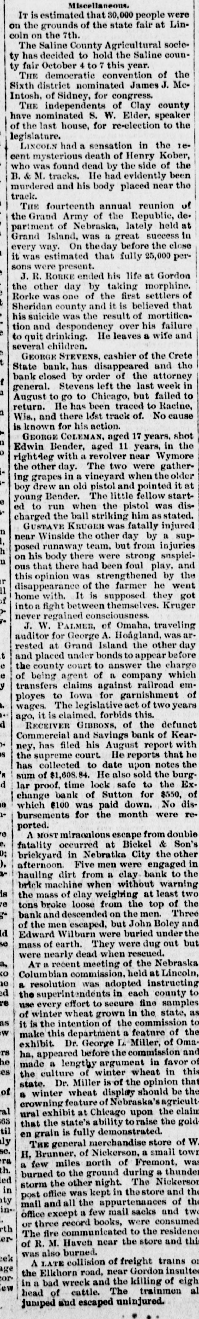IT is estimated that Miscellaneous. 30,000 people on the grounds of the state fair at coln on the 7th. The Saline County Agricultural socie ty has decided to hold the Saline ty fair October 4 to 7 this year. THE democratic convention of Sixth district nominated James J. Intosh, of Sidney, for congress. THE independents of Clay county have nominated S. W. Elder. speake of the last legislature. house, for re-election to LINCOLN had a sensation in the cent mysterious death of Henry Kober who was found dead by the side of B. & M. tracks. He had evidently track. murdered and his body placed near THE fourteenth annual reunion the Grand Army of the Republic, partment of Nebraska, lately held Grand Island, was a great success every way. On theday before the it was estimated that fully 25,000 sons were present. J. R. RORKE ended his life at Gordon the other day by taking morphine Rorke was one of the first settlers Sheridan county and it is believed tha his suicide was the result of mortifica tion and despondency over his failur to quit drinking. He leaves a wife several children. GEORGE STEVENS, cashier of the Cret State bank, has disappeared and bank closed by order of the attorne general. Stevens left the last week August to go to Chicago, but failed return. He has been traced to Racine Wis., and there lost track of. No is known for his action. GEORGE COLEMAN, aged 17 years, Edwin Bender, aged 11 years, in rightleg with a revolver near Wymor the other day. The two were gather ing grapes in a vineyard when the boy drew an old pistol and pointed it young Bender. The little fellow ed to run when the pistol was charged the ball striking him as stated GUSTAVE Kruger was fatally injure near Winside the other day by a posed runaway team, but from injurie on his body there were strong suspie ous that there had been foul play, this opinion was strengthened by disappearance of the farmer he home with. It is supposed they into a fight between themselves. Kruge never regained consciousness. J. W. PALMER, of Omaha, travelin auditor for George A. Hoågland, was rested at Grand Island the other and placed under bonds to appear be the county court to answer the charg of being agent of a company whic transfers claims against railroad ployes to Iowa for garnishment wages. The legislative act of two ago, it is claimed, forbids this. RECEIVER GIBBONS, of the defund Commercial and Savings bank of ney, has filed his August report the supreme court He reports that has collected to date upon notes sum of $1,608.84. He also sold the burg $550 for lar change proof, bank time of lock Sutton safe to the