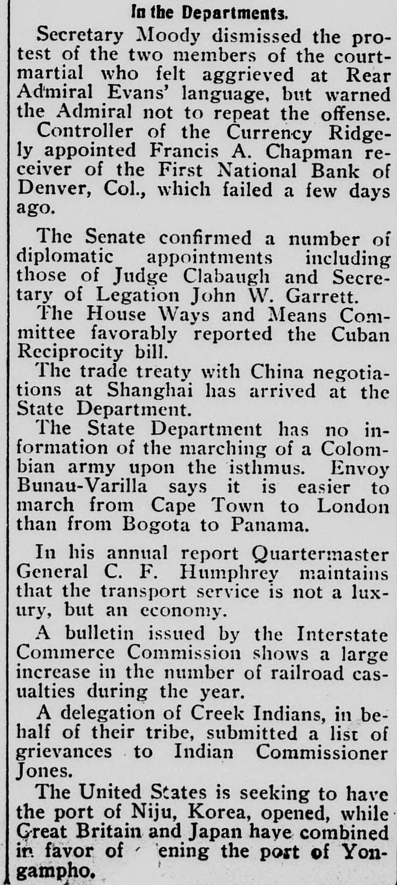 In the Departments. Secretary Moody dismissed the protest of the two members of the courtmartial who felt aggrieved at Rear Admiral Evans' language, but warned the Admiral not to repeat the offense. Controller of the Currency Ridgely appointed Francis A. Chapman receiver of the First National Bank of Denver, Col., which failed a few days ago. The Senate confirmed a number of diplomatic appointments including those of Judge Clabaugh and Secretary of Legation John W. Garrett. The House Ways and Means Committee favorably reported the Cuban Reciprocity bill. The trade treaty with China negotiations at Shanghai has arrived at the State Department. The State Department has no information of the marching of a Colombian army upon the isthmus. Envoy Bunau-Varilla says it is easier to march from Cape Town to London than from Bogota to Panama. In his annual report Quartermaster General C. F. Humphrey maintains that the transport service is not a luxury, but an economy. A bulletin issued by the Interstate Commerce Commission shows a large increase in the number of railroad casualties during the year. A delegation of Creek Indians, in behalf of their tribe, submitted a list of grievances to Indian Commissioner Jones. The United States is seeking to have the port of Niju, Korea, opened, while Great Britain and Japan have combined in favor of ening the port of Yongampho.