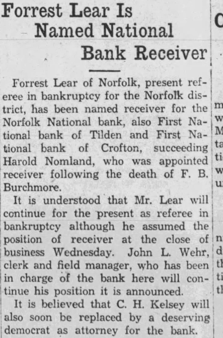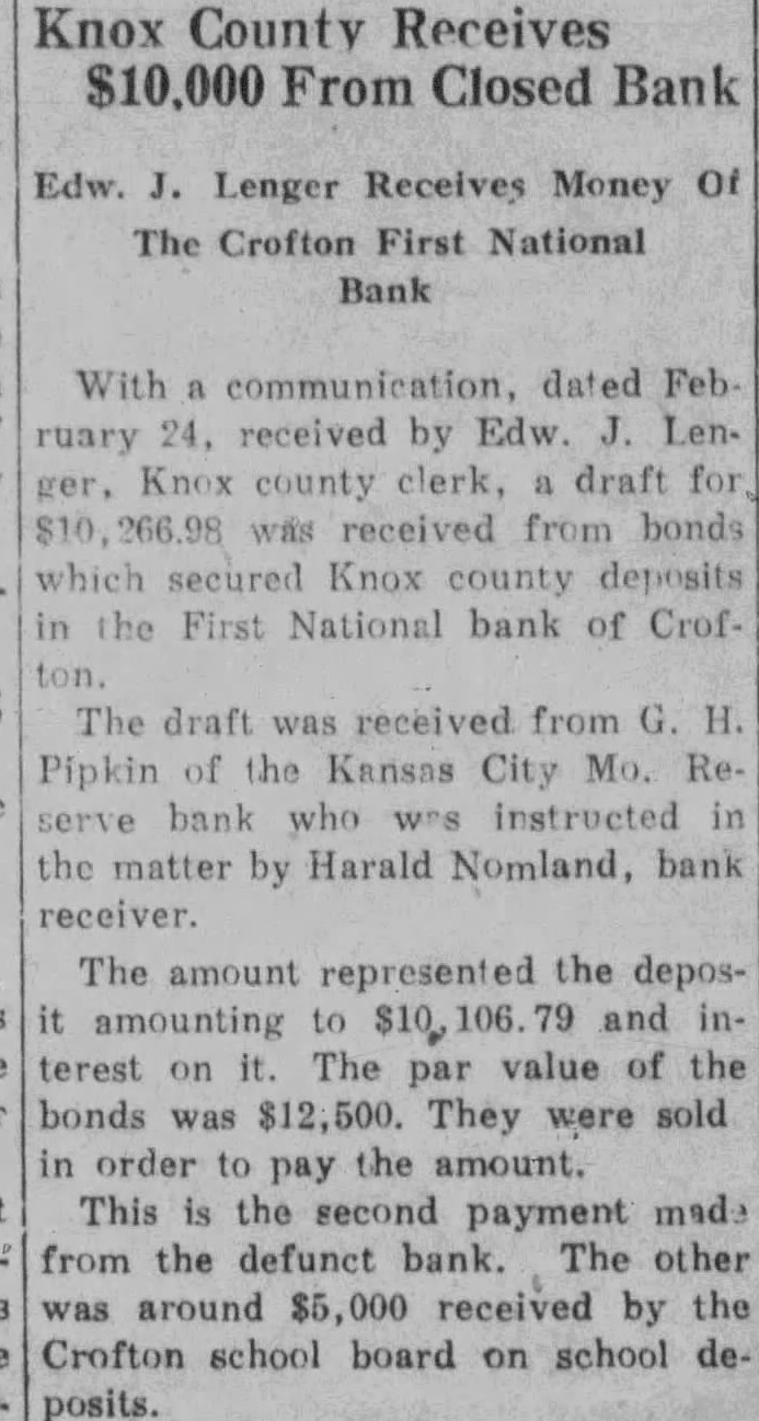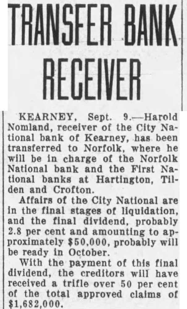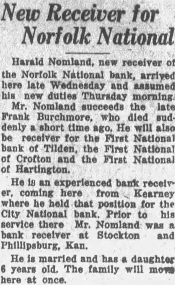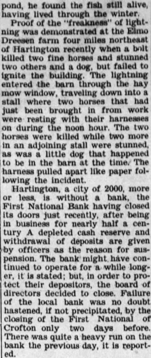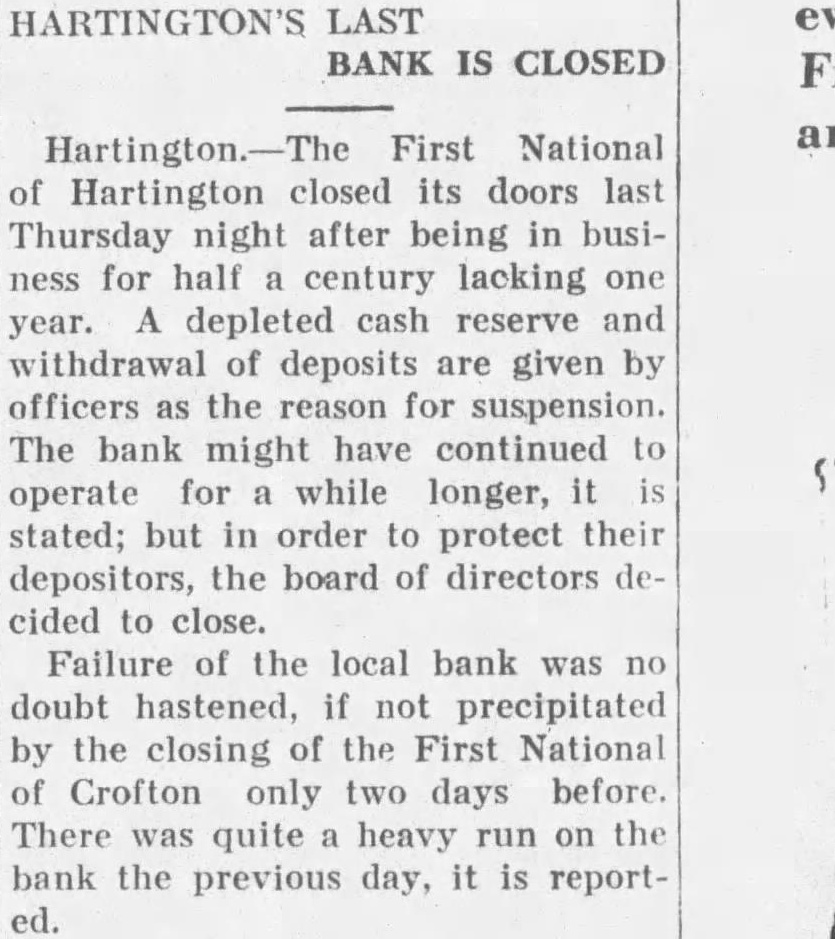 IS CLOSED YEARS AFTER 49 OF SERVICE First National Forced To Suspend on Account of a Depleted Reserve Last Bank Is First National Once Had Deposits People Are Shocked by Closing The First National Bank Hartington last Thursday night being for half century lackyear. depleted cash and withdrawal given officers the for pension The bank might have operate for while longer, stated but, in order protect their depositors, the board of directors decided to Failure of the local bank doubt hastened, if not precipitated. the closing the First of Crofton only two days before. There quite heavy the bank the previous People Were Stunned People have accustomed do business with the First National Bank of Hartington for many years stunned when they down town Friday morning and found notice door that was closed. The failure this bank the which Hartington and county without facilities. years had strong banks. The Hartington National in 1928, Cedar County 1931 and the First National in the hands Other Cedar county banks have failed during the past Farmers State and the Fordyce State. The this city Organized in 1883 Organized 1883, was one the oldest and strongest banks northeast Nebraska and at deposits almost In June, 1920 peak year, deposits aggregated $950,000. When bank closed deposits had dwindled to In the First National and the Farmers State Bank. which located the present Hartington Building Loan building, merged occupied building on the corner Washington avenue and Fifth street. Officers the bank when closed its doors were Louis Goetz, president; Beste, vice-presiCarl cashier, and Lloyd Lynde Alphonse Lamassistant cashiers. Louis Goetz. Spork, John Hirschman, Carl Pedersen. Geo. Beste and Lloyd Lynde and the following owned stock the First National Bank: Amundson, Theo. Beste estate, Beste, Cameron, Dendinger, Dorsey, Mrs. Dan Felber, George, Louis Goetz, Aug Gohman, Mrs. Sarah Gordon, John Hochstein Mrs. Ethel Kerr estate, Krause, Lammers, K. Lammers, Lammers, McKenzie, Lloyd Lynde, Mrs. Ella Mason, Mrs. Hazel Olsen, Oswald, LuR. Parks, Pedersen, Peters, Ready, Mrs. Ready, Mrs. Robinson, Helen Scoville, Scoville, Spork, Agatha Uhing estate and Mildred W. Haggart. Lyon, bank examiner, arrived Friday make the inventory and now charge. Officers state that the percentof dividends which the institution will pay will depend on this year's and the prices which brings. Three former ficers of the First National and prominent its affairs for many Robinson, R. G. Mason and Weston.