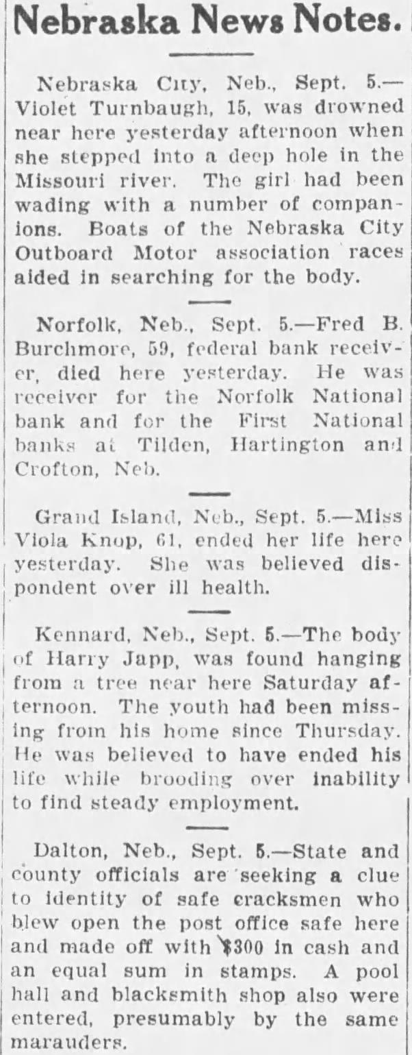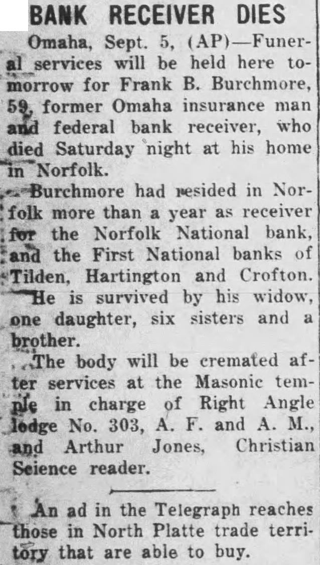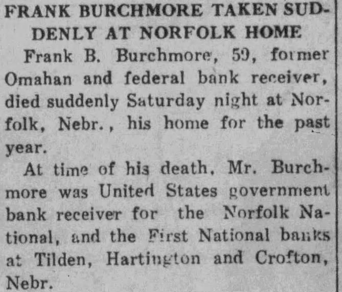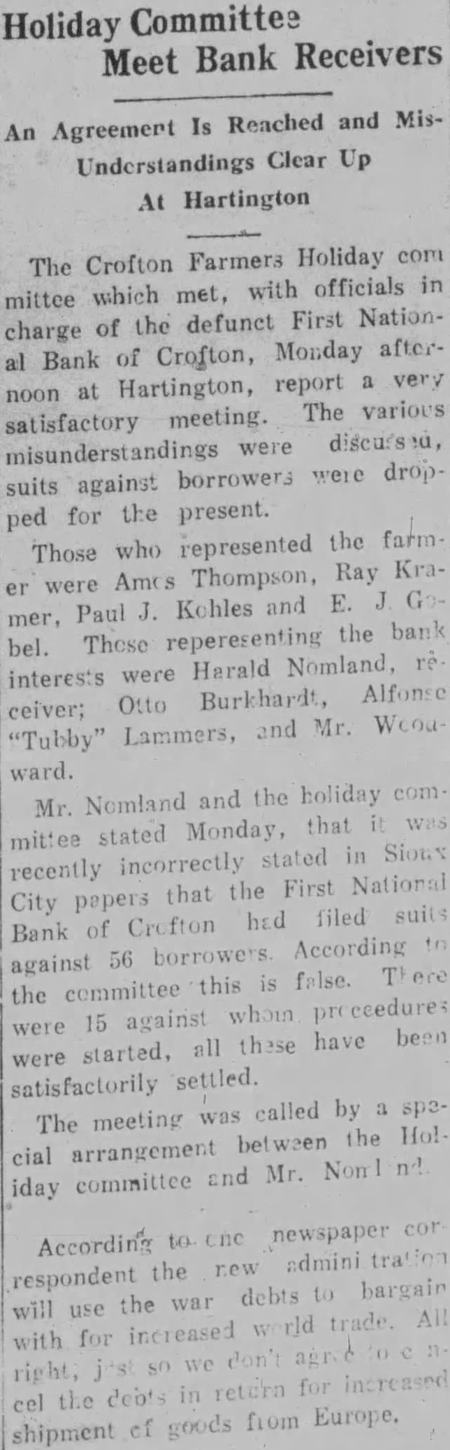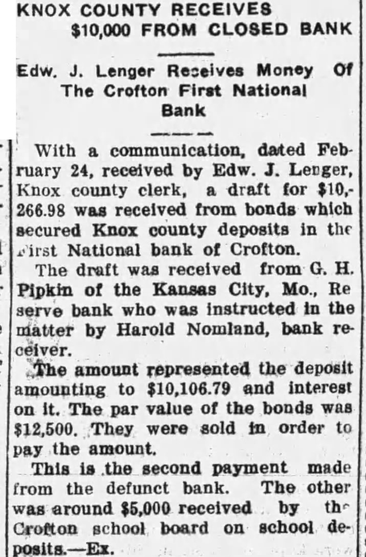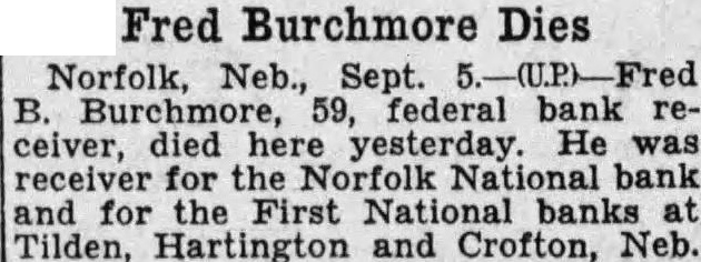 IS CLOSED YEARS AFTER 49 OF SERVICE First National Forced To Suspend on Account of a Depleted Reserve Last Bank Is First National Once Had Deposits People Are Shocked by Closing The First National Bank Hartington last Thursday night being for half century lackyear. depleted cash and withdrawal given officers the for pension The bank might have operate for while longer, stated but, in order protect their depositors, the board of directors decided to Failure of the local bank doubt hastened, if not precipitated. the closing the First of Crofton only two days before. There quite heavy the bank the previous People Were Stunned People have accustomed do business with the First National Bank of Hartington for many years stunned when they down town Friday morning and found notice door that was closed. The failure this bank the which Hartington and county without facilities. years had strong banks. The Hartington National in 1928, Cedar County 1931 and the First National in the hands Other Cedar county banks have failed during the past Farmers State and the Fordyce State. The this city Organized in 1883 Organized 1883, was one the oldest and strongest banks northeast Nebraska and at deposits almost In June, 1920 peak year, deposits aggregated $950,000. When bank closed deposits had dwindled to In the First National and the Farmers State Bank. which located the present Hartington Building Loan building, merged occupied building on the corner Washington avenue and Fifth street. Officers the bank when closed its doors were Louis Goetz, president; Beste, vice-presiCarl cashier, and Lloyd Lynde Alphonse Lamassistant cashiers. Louis Goetz. Spork, John Hirschman, Carl Pedersen. Geo. Beste and Lloyd Lynde and the following owned stock the First National Bank: Amundson, Theo. Beste estate, Beste, Cameron, Dendinger, Dorsey, Mrs. Dan Felber, George, Louis Goetz, Aug Gohman, Mrs. Sarah Gordon, John Hochstein Mrs. Ethel Kerr estate, Krause, Lammers, K. Lammers, Lammers, McKenzie, Lloyd Lynde, Mrs. Ella Mason, Mrs. Hazel Olsen, Oswald, LuR. Parks, Pedersen, Peters, Ready, Mrs. Ready, Mrs. Robinson, Helen Scoville, Scoville, Spork, Agatha Uhing estate and Mildred W. Haggart. Lyon, bank examiner, arrived Friday make the inventory and now charge. Officers state that the percentof dividends which the institution will pay will depend on this year's and the prices which brings. Three former ficers of the First National and prominent its affairs for many Robinson, R. G. Mason and Weston.