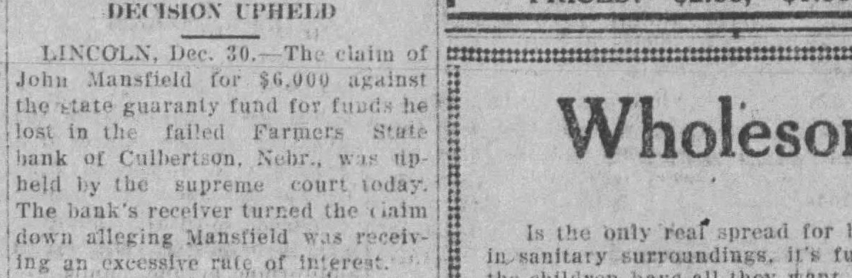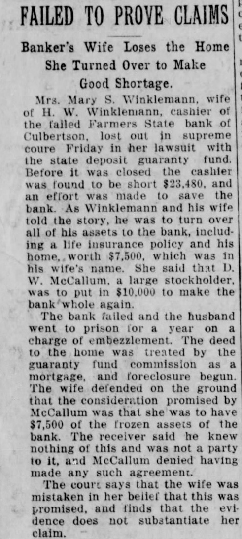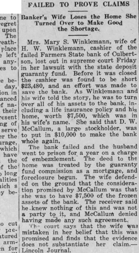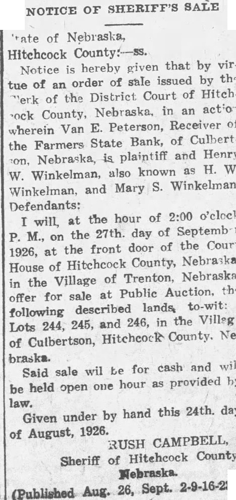 'tate of Nebraska, Notice is hereby given that by virtue of an order of sale issued by the "erk of the District Court of Hitchock County, Nebraska, in an action wherein Van E. Peterson, Receiver of the Farmers State Bank, of Culberton, Nebraska, is plaintiff and Henry W. Winkelman, also known as H. W Winkelman, and Mary S. Winkelman Defendants: I will, at the hour of 2:00 o'clock P. M., on the 27th. day of Septemb 1926, at the front door of the Court House of Hitchcock County, Nebraska in the Village of Trenton, Nebraska offer for sale at Public Auction, the following described lands, to-wit: Lots 244, 245, and 246, in the Villag of Culbertson, Hitchcock County. Ne braska. Said sale will be for cash and will be held open one hour as provided by law.