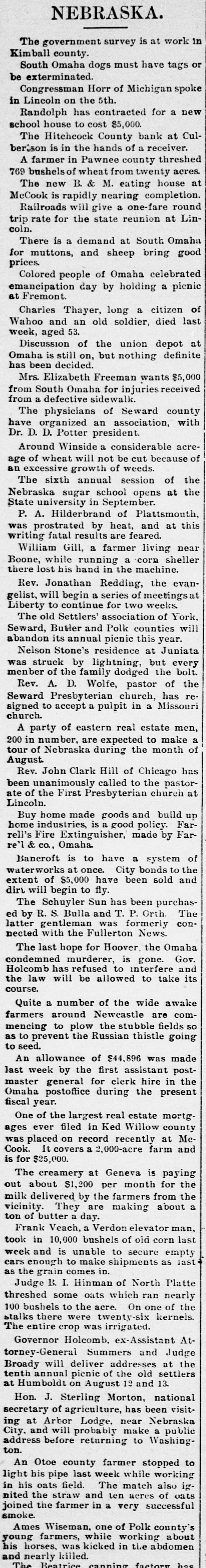 NEBRASKA. The government survey is at work Kimball South Omaha county. dogs must have tags be exterminated. Congressman Horr of Michigan spoke in Lincoln on the 5th. Randolph has contracted for a new school house to cost $5,000. The Hitchcock County bank at Culber&son is in the hands of a receiver. farmer in Pawnee county threshed acres. A bushels of wheat from twenty house at 769 The new B. & M. eating McCook is rapidly nearing completion. round Railroads will give a one-fare Lintrip rate for the state reunion at coln. There is a demand at South Omaha good for muttons, and sheep bring prices. Colored people of Omaha celebrated at Fremont. emancipation day by holding a picnic Charles Thayer, long a citizen last of Wahoo and an old soldier, died week, aged 53. Discussion of the union depot at Omaha is still on, but nothing definite has been decided. Mrs. Elizabeth Freeman wants $5,000 from South Omaha for injuries received from a defective sidewalk. The physicians of Seward county with have organized an association, Dr. D. D. Potter president. Winside a considerable acreof wheat will not be cut of an growth of age Around excessive weeds. because The sixth annual session of the the sugar school opens at in State Nebraska university September. P. A. Hilderbrand of Plattsmouth, this was prostrated by heat, and at writing fatal results are feared. Gill, a farmer living near while running a corn Boone, William machine. sheller there lost his hand in the Jonathan Redding, evanwill begin a series of gelist, Rev. meetingsat weeks. the Liberty to continue for two Settlers' association of York, Butler and Polk Seward, The old counties this will abandon its annual picnic year. Nelson Stone's residence at Juniata struck by lightning, but every bolt. was menber of the family dodged the Rev. A. D. Wolfe, pastor of the Seward Presbyterian church, has rechurch. signed to accept a pulpit in a Missouri A party of eastern real estate men, in number, are expected to make a 200 tour of Nebraska during the month of August. Rev. John Clark Hill of Chicago has been unanimously called to the pastor- at ate of the First Presbyterian church Lincoln. Buy home made goods and build Far- up home industries, is a good policy. rell's Fire Extinguisher, made by Farre'l co., Omaha Bancroft is to have a system of at once. City of $5,000 have been extent waterworks bonds sold to and the dirt will begin to fly. Sun has been The Schuyler Orth. purchas- The ed by R. S. Bulla and T. P. conlatter was formerly nected with the Fullerton The gentleman hope News. the last for Hoover. Omaha murderer, is gone. Gov. refused to and condemned Holcomb has interfere take the law will be allowed to its course. Quite a number of the wide awake farmers around Newcastle are commencing to plow the stubble fields so as to prevent the Russian thistle going to seed. An allowance of $44,896 was made last week by the first assistant postmaster general for clerk hire in the Omaha postoffice during the present fiscal year. One of the largest real estate mortgages ever filed in Ked Willow county was placed on record recently at MeCook. It covers a 2,000-acre farm and is for $25,000. The creamery at Geneva is paying out about $1,200 per milk delivered by the farmers the month from about for the a vicinity. They are making ton of butter day. Frank Veach, a Verdon elevator man, took in 10,000 bushels of old corn last and is unable to secure empty week enough to make shipments as last as the grain comes in. Judge B. I. Hinman of North Platte threshed some oats which ran nearly to the acre. On one of the there were twenty-six kernels. stalks 100 bushels irrigated. The entire crop was Governor Holcomb. ex-Assistant Attorney-General Summers and Judge Broady will deliver addresses at the annual picnic of the old settlers tenth and 13. at Humboldt on August 12 Hon. J. Sterling Morton, national of visitsecretary agriculture, has been Nebraska at Arbor Lodge, near and will make a City, ing probably Washing- public address before returning to ton. / An Otoe county farmer stopped to his pipe last week while working light also in his oats field. The match ignited the straw and ten acres of oats joined the farmer in a very successful smoke. Ames Wiseman. one of Polk county's farmers, while his was kicked in ti.e young horses, working abdomen about and nearly killed. The Beatrice canning factory has