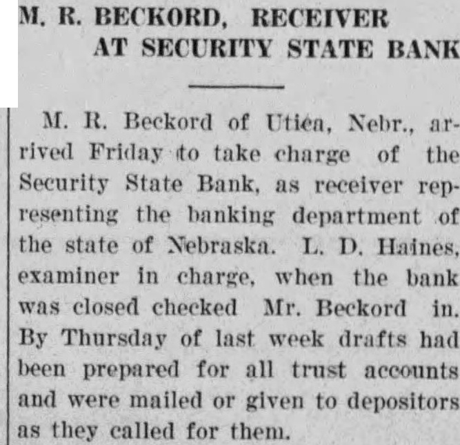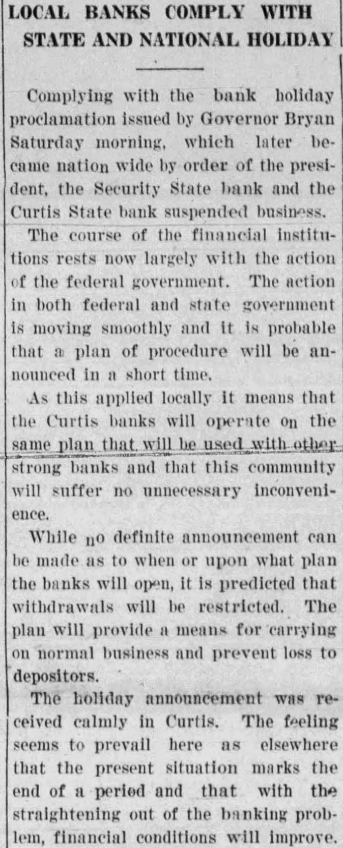 LOCAL BANKS COMPLY WITH STATE AND NATIONAL HOLIDAY Complying with the bank holiday proclamation issued by Governor Bryan Saturday morning. which later became nation wide by order of the president, the Security State bank and the Curtis State bank suspended business. The course of the financial institutions rests now largely with the action of the federal government. The action in both federal and state government is moving smoothly and it is probable that a plan of procedure will be announced in a short time. As this applied locally it means that the Curtis banks will operate on the same plan that will be used with other strong banks and that this community will suffer no unnecessary inconvenience. While no definite announcement can be made as to when or upon what plan the banks will open, it is predicted that withdrawals will be restricted. The plan will provide a means for carrying on normal business and prevent loss to depositors. The holiday announcement was received calmly in Curtis. The feeling seems to prevail here as elsewhere that the present situation marks the end of a period and that with the straightening out of the banking problem, financial conditions will improve.