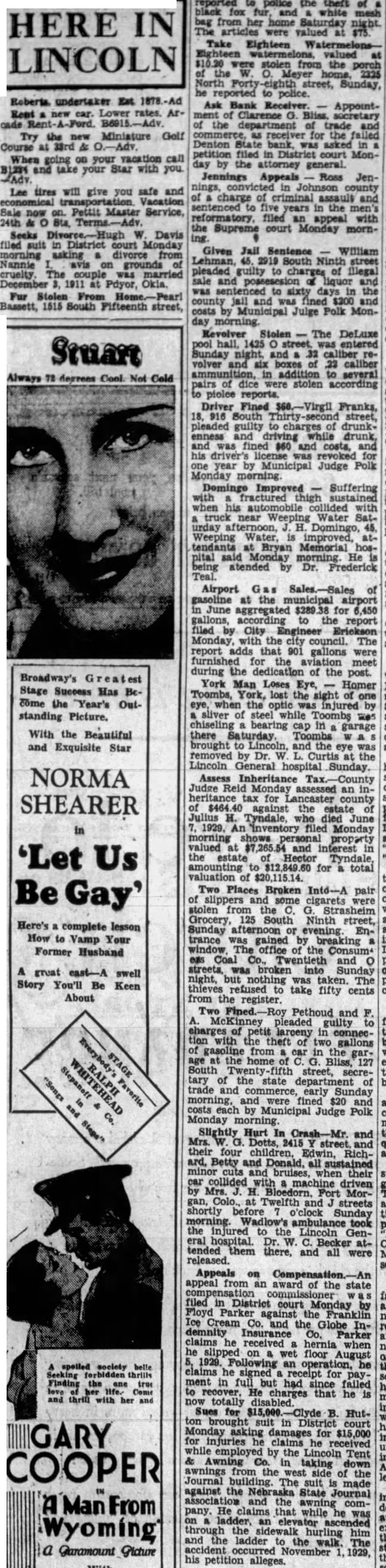 HERE IN LINCOLN undertaker Rent Lower Try the Gelf Course going on your vacation call and your Star with will safe Vacation Pettit Master Seeks Davis filed in District court Monday asking divorce from Nannie grounds The was married December at Pdyor, Okia, Fur Stolen Bassett, 1515 South Fifteenth street, reported to police the theft of black fox white from her home Saturday articles were valued Take Eighteen Eighteen valued stolen from the porch North street, Sunday, reported to police. Bank AppointClarence G. secretary the department trade receiver the failed Denton State bank, asked petition filed in court Monby the attorney general. Jennings Appeals Ross Jenin charge of criminal assault five in the reformatory, filed an with the Supreme court Monday mornGiven Jail Sentence William Lehman, 45. South Ninth street pleaded guilty to charges of illegal and liquor sentenced to sixty days county jail and was fined $200 costs by Municipal Monday morning. Revolver Stolen DeLuxe pool hall, 1425 entered Sunday caliber volver six boxes caliber in addition to several of stolen piolee Driver Fined 18, 916 South street, pleaded to charges drunkenness driving while drunk, and was fined $60 and and his driver's license revoked year by Municipal Judge Polk Monday Improved Suffering with fractured thigh sustained when his collided near Weeping Water urday afternoon, Domingo, Weeping Water, tendants at Bryan Memorial hospital said Monday morning He atended Dr. Frederick Teal. Airport Gas of at June aggregated for 6,450 gallons, according to the report filed by City Erickson Monday, council. The report gallons were furnished meet during the dedication of the post. York Man Loses Homer Toombs, York, lost the sight one eye, when the optic injured sliver of steel while Toombs was chiseling bearing cap garage there Saturday. Toombs brought and the eye was removed Dr. Curtis Lincoln General Sunday. Assess Inheritance Judge Monday assessed an heritance for Lancaster of $464.40 estate Julius H. Tyndale, June 1929. An filed Monday morning shows valued at and interest the estate Hector for total valuation of $20,115.14. Two Places Broken Into-A pair cigarets stolen from Grocery, 125 South Ninth street, Sunday afternoon evening trance was gained by breaking window. office the eas Coal Twentieth and o streets, was broken into Sunday night, but nothing taken. The thieves refused take fifty cents from the register. Two Pethoud and McKinney pleaded eharges petit larceny in connection with the theft two gallons gasoline from car in the age the home Bliss, South Twenty street, secretary of the state department by trade early Sunday and were fined $20 costs each by Municipal Judge Polk Monday Slightly Hurt and Mrs. Dotts, 2415 their four ard. Betty and Donald, all sustained minor cuts and bruises, their collided machine driven by Morgan, Twelfth streets as shortly o'clock Sunday morning the injured the Lincoln eral attended them there, and all were released. Appeals on Compensation. appeal from an award of the state compensation commissioner filed in District court Monday by as Floyd Parker Franklin against the Ice Cream and the Globe Indemnity Insurance Parker claims he received hernia he slipped floor wet August 1929. Following an he claims he signed receipt for ment in but had since failed to recover. He charges that he totally Sues $15,000 B. Hutbrought in Monday asking damages for $15,000 for injuries he claims he received while employed by the Lincoln Tent & Awning taking awnings from the west of the Journal building. The suit made against association the State Journal and the awning pany. ladder, He claims that while he was on an through sidewalk him and the ladder to the hurling accident occurred November 1929, his petition alleges.