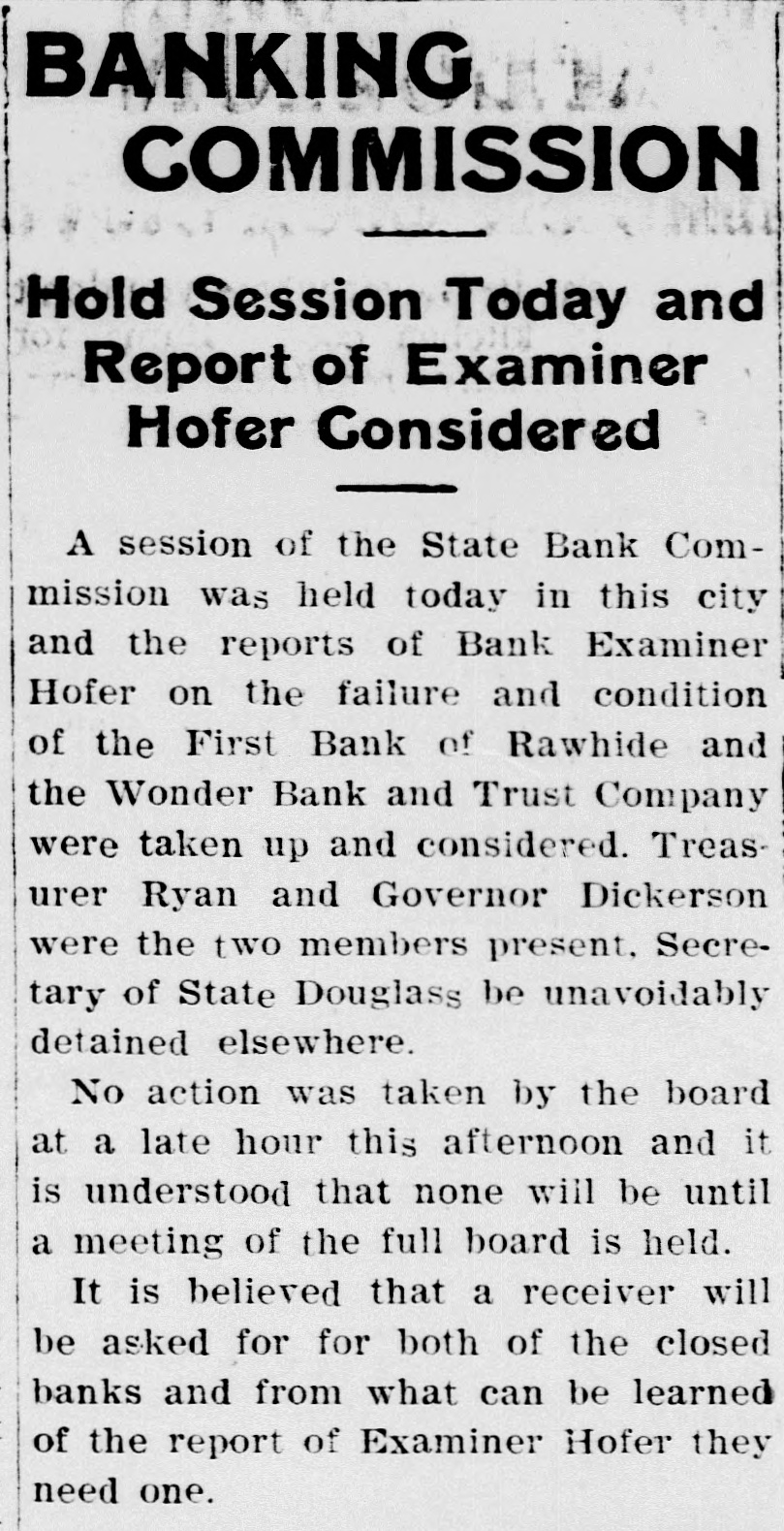 BANKING NY COMMISSION Hold Session Today and Report of Examiner Hofer Considered A session of the State Bank Commission was held today in this city and the reports of Bank Examiner Hofer on the failure and condition of the First Bank of Rawhide and the Wonder Bank and Trust Company were taken up and considered. Treasurer Ryan and Governor Dickerson were the two members present, Secretary of State Douglass be unavoidably detained elsewhere. No action was taken by the board at a late hour this afternoon and it is understood that none will be until a meeting of the full board is held. It is believed that a receiver will be asked for for both of the closed banks and from what can be learned of the report of Examiner Hofer they need one.