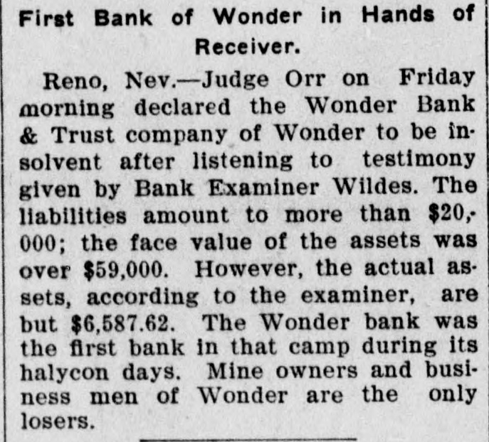 First Bank of Wonder in Hands of Receiver. Reno, Nev.-Judge Orr on Friday morning declared the Wonder Bank & Trust company of Wonder to be insolvent after listening to testimony given by Bank Examiner Wildes. The liabilities amount to more than $20,000; the face value of the assets was over $59,000. However, the actual assets, according to the examiner, are but $6,587.62. The Wonder bank was the first bank in that camp during its halycon days. Mine owners and business men of Wonder are the only losers.
