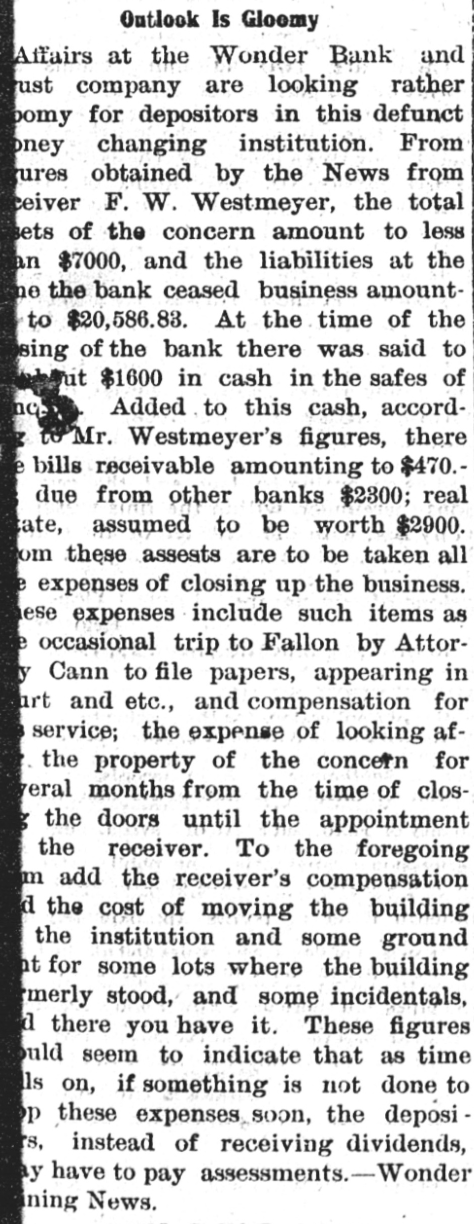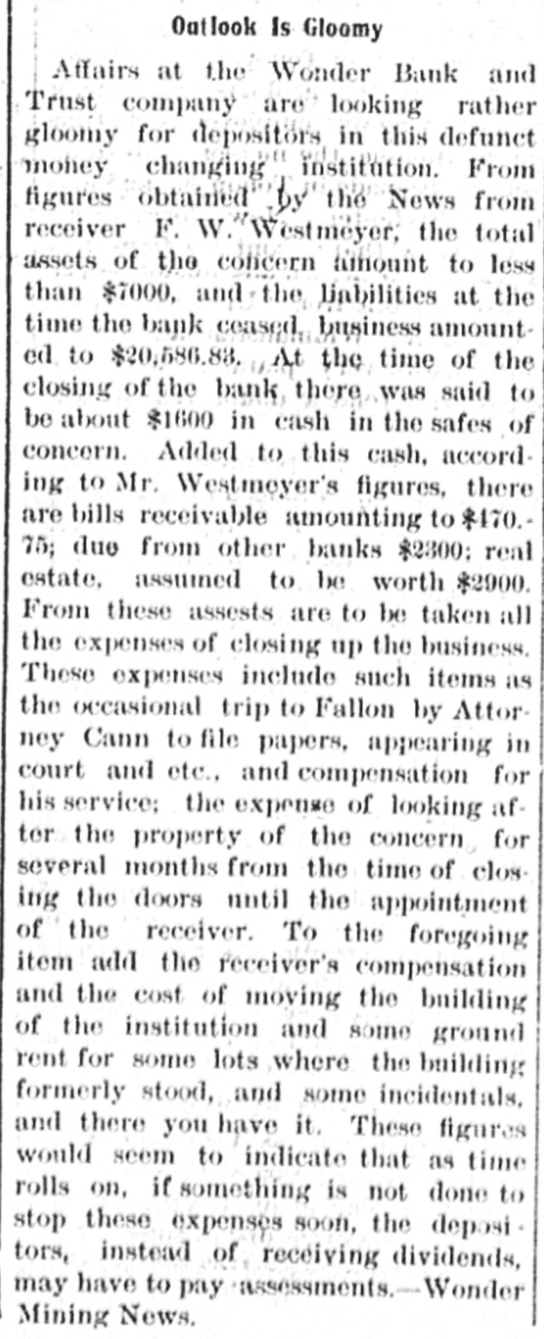 From these assests are to be taken all the expenses of closing up the business. These expenses include such items as the occasional trip to Fallon by Attorney Cann to file papers, appearing in court and etc., and compensation for service; the expense of looking after the property of the concern for several months from the time of closing the doors until the appointment of the receiver. To the foregoing must be added the receiver's compensation and the cost of moving the building to the institution and some ground rent for some lots where the building formerly stood, and some incidentals, and there you have it. These figures would seem to indicate that as time rolls on, if something is not done to stop these expenses soon, the depositors, instead of receiving dividends, may have to pay assessments.—Wonder Mining News.