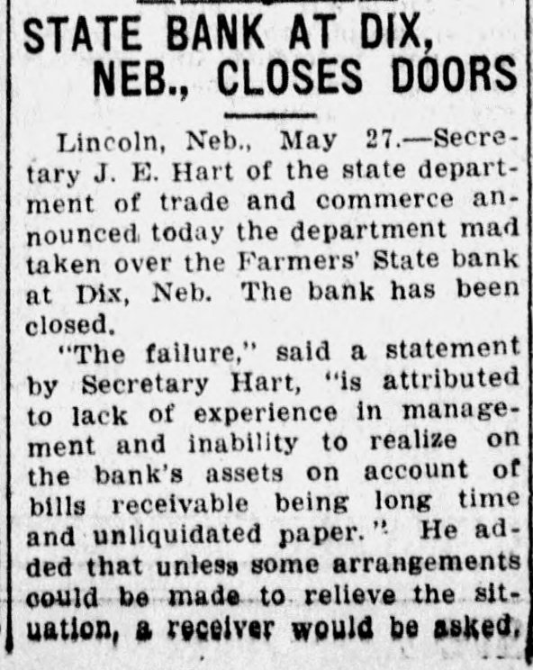 STATE BANK AT DIX, NEB., CLOSES DOORS Lincoln, Neb., May 27.-Secretary J. E. Hart of the state department of trade and commerce announced today the department mad taken over the Farmers' State bank at Dix, Neb. The bank has been closed. "The failure," said a statement by Secretary Hart, "is attributed to lack of experience in management and inability to realize on the bank's assets on account of bills receivable being long time and unliquidated paper." He added that unless some arrangements could be made to relieve the situation, a receiver would be asked,