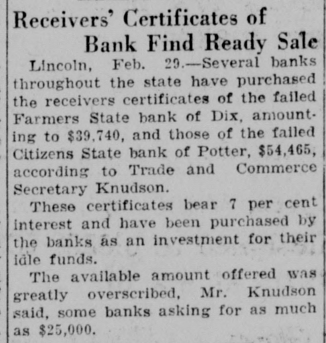 Receivers' Certificates of Bank Find Ready Sale Lincoln, Feb. 29.-Several banks throughout the state have purchased the receivers certificates of the failed Farmers State bank of Dix, amount. ing to $39,740, and those of the failed Citizens State bank of Potter, $54,465, according to Trade and Commerce Secretary Knudson. These certificates bear 7 per cent interest and have been purchased by the banks as an investment for their idle funds. The available amount offered was greatly overscribed, Mr. Knudson said, some banks asking for as much as $25,000.