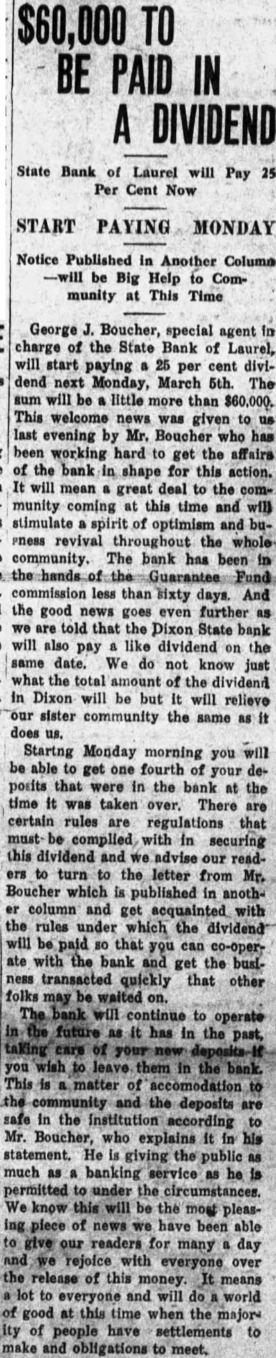 $60,000 PAID A DIVIDEND State Bank of Laurel will Pay 25 Per Cent Now START PAYING MONDAY Notice Published in Another Column be Big Help to Community at This Time George J. Boucher, special agent in charge of the State Bank of Laurel, will start paying 25 per cent dividend next Monday, March 5th. The sum will be little more than $60,000. This welcome news was given to us last evening by Mr. Boucher who has been working hard to get the affairs of the bank in shape for this action. It will mean great deal to the community coming at this time and will stimulate spirit of optimism and burevival throughout the whole community. The bank has been in Guarantee Fund commission less than sixty And days. the good news further goes even as we are told that the Dixon State bank will also a like dividend the pay on same date. We do not know just what the total amount of the dividend Dixon will be but will relieve our sister community the same it as does us. Startng Monday morning will you be able to get one fourth of your deposits that were in the bank at the time it was taken There over. are certain rules are regulations that must be with in securing this dividend and advise our readers to turn to the letter from Mr. Boucher which is published in another column and get acquainted with the rules under which the dividend will be paid so that you can co-operate with the bank and get the business transacted quickly that other folks may be waited on. bank will continue to operate future as it has in the past, taking care of deposits. you to leave them in the bank. This is matter of accomodation to the community and the deposits are safe in the Institution according to Mr. Boucher, who explains it in his statement. He is giving the public as much as banking service as he is permitted to under the circumstances. We know this will be the most pleasing piece of news we have been able to give our readers for many day and we rejoice with everyone over the release of this money. It means to everyone and will do world of good at this time when the majors ity of people have settlements to make and obligations to meet.