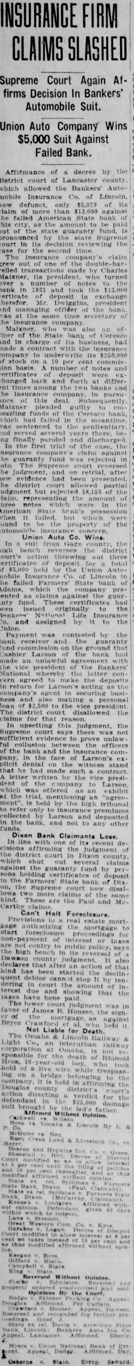 INSURANCE FIRM Supreme Court Again Affirms Decision In Bankers' Automobile Suit. Union Auto Company Wins $5,000 Suit Against Failed Bank. Affirmance of decree by the district court of Lancaster county which allowed the Bankers' Automobile Insurance Co. of Lincoln, now only $5,079 its claim of more than against the failed American State bank of this city, as the amount be paid out of the guaranty fund. by state court decision the for the second insurance claim grew one of the relled made by Charles its who turned over number notes bank in 1921 and took certicate deposit exchange therefor president and officer the bank. secretary the company Maixner. who of the State bank Ceresco and in charge its business, had made the company to underwrite its $250,000 of on 10 per commisnotes and certificates changed back and forth differthe two banks this Maixner pleaded guilty to bezzling funds of the Ceresco bank which failed the meantime to the served ing finally paroled and the first trial of the guaranty fund was rejected Supreme court the judgment, and on retrial, after evidence had been presented. the district court partial but of the claim. the three which In the American State when but were found the property of the Union Auto Co. Wins. In suit from Gage the high district court's throwing out three certificates deposit total held by the mobile Co. of Lincoln the failed Farmers' State bank Adams, which company presented as claims against the guarfund. These certificates originally Life and assigned by it to the Union. Payment was contested by bank receiver guaranty fund on the ground that Cashier Larson the bank had made an unlawful agreement with president the Bankers' National whereby the make the for acting company's agent business and also making personal the vice district court disallowed the claims for that reason. In upsetting this judgment, the court not sufficient prove unlaw ful officers the bank the company. in the face of Larson's plicit denial on the stand that he had such contract. letter written by the vice president the company to Larson, which was offered an exhibit the "agreement" held by the tribunal collected Larson and deposited in bank, and not to any other Dixon Bank Claimants Lose. In line of its recent affirming the judgment court in Dixon which shut claims against the fund by perholding deposit the Farmers' State bank of Dix on, the Supreme court now disalmore claims of the kind These are the Paul and same McCarthy claims. Can't Halt Foreclosure. real estate gage the mortgage start foreclosure for of taxes the contry to public policy, says high bench in Dawson county also declares that after an action of that kind started the declinquent stop by dering in the of terest taxes have due and showing that the The lower judgment was in of James B. Houser, the sign against Bryce Not Liable for Death. The Railway Light corporation not sponsible for death Rhinold Hron, hold while on bridge to the held in the county action directing verdict for the defendant $25,000 damage Opinion. Omaha Lincoln Ry Creek Land Livestock and given modified Without Opinions the Court. further National Bank Dodge