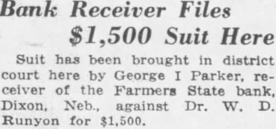 Suit has been brought district court here by George Parker, ceiver the Farmers State bank, Dixon, Neb., against Dr. W. Runyon for $1,500.