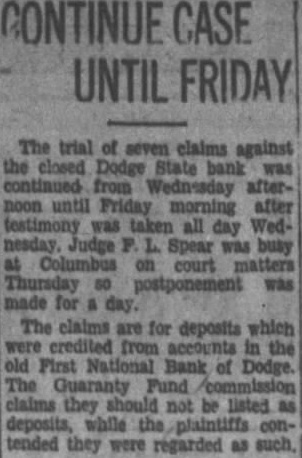 CONTINUE CASE UNTIL FRIDAY The trial of seven claims against the closed Dodge State bank was continued from Wednesday afternoon until Friday morning after testimony was taken all day Wednesday. Judge Spear was busy Columbus on court matters Thursday was made for day. The claims are for deposits which credited the old First National Bank of Dodge. The Fund claims they not be listed deposits, while the tended they were regarded as such,