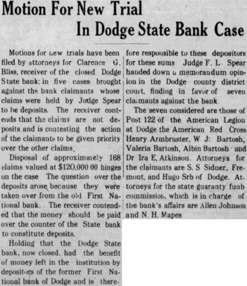 Motion For New Trial In Dodge State Bank Case Motions for new trials have been filed by attorneys for Clarence G. Bliss, receiver of the closed Dodge State bank: in five cases brought against the bank claimants whose claims were held by Judge Spear to he deposits. The receiver contends that the claims are not deposits and is contesting the action of the claimants to be given priority over the other claims, Disposal of approximately 168 claims valued at $120,000 00 hinges on the case The question over the deposits arose because they were taken over from the old First National bank. The receiver contended that the money should be paid over the counter of the State bank to constitute deposits. Holding that the Dodge State fore responsible to these depositors for these sums Judge F. L Spear handed down u memorandum opinion in the Dodge county district court, finding in favor of seven claimants against the bank The seven considered are those of Post 122 of the American Legion at Dodge the American Red Cross Henry Armbruster, W J: Bartosh, Valeria Bartosh, Albin Bartosh and Dr Ira E. Atkinson. Attorneys for the claimants are S. S Sidner, Fremont, and Hugo Srb of Dodge. At. torneys for the state guaranty funb commission. which is in charge of the bank's affairs are Allen Johnson and N. H. Mapes