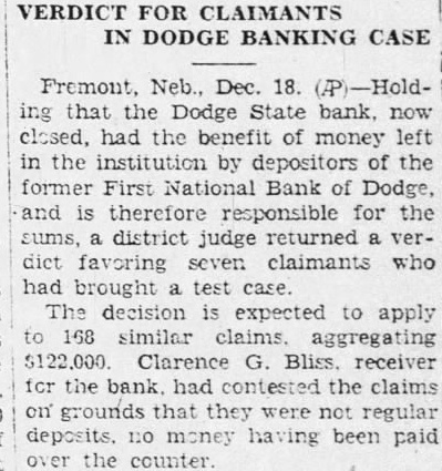 VERDICT FOR CLAIMANTS IN DODGE BANKING CASE Fremont, Neb., Dec. 18. ing that the Dodge State bank, now closed, had the benefit money left in the by depositors of the former First Bank of Dodge, and is therefore for the sums, district judge returned verdict favoring seven claimants who brought case. The decision is expected to apply 168 similar claims. aggregating Clarence receiver the bank. had contested the claims on grounds that they were not regular deposits. no money having been paid the counter.