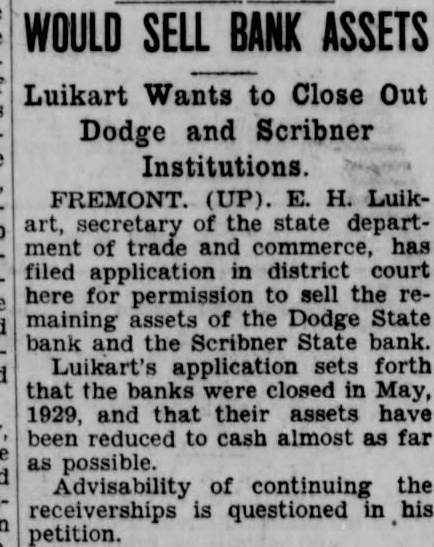 WOULD SELL BANK ASSETS Luikart Wants to Close Out Dodge and Scribner Institutions. FREMONT. (UP). E. Luikart, the state departof trade filed in district sell the reassets of Dodge State and the State bank. application sets forth that the May, 1929, and that their assets have reduced to cash almost as far possible. Advisability of continuing the receiverships is questioned petition.