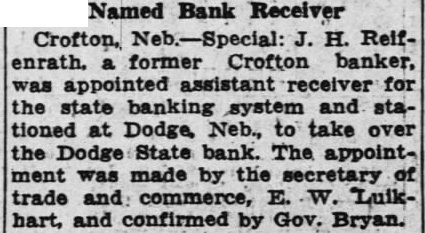 Named Bank Receiver Crofton, H. Reifenrath. former Crofton banker, was appointed assistant receiver for the state banking system and stationed at Dodge, Neb., to take over the Dodge State bank. The appointment was made by the secretary trade and commerce, W. Luikhart, and confirmed by Gov. Bryan.