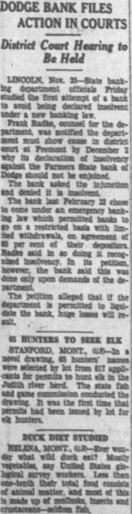 DODGE, Neb. (/P). The celebration for the reopening of the Farmers State bank, originally set for Saturday, has been postponed because of uncertainty when the bank will reopen. The routine of having the bank approved for federal deposit insurance is causing the delay.