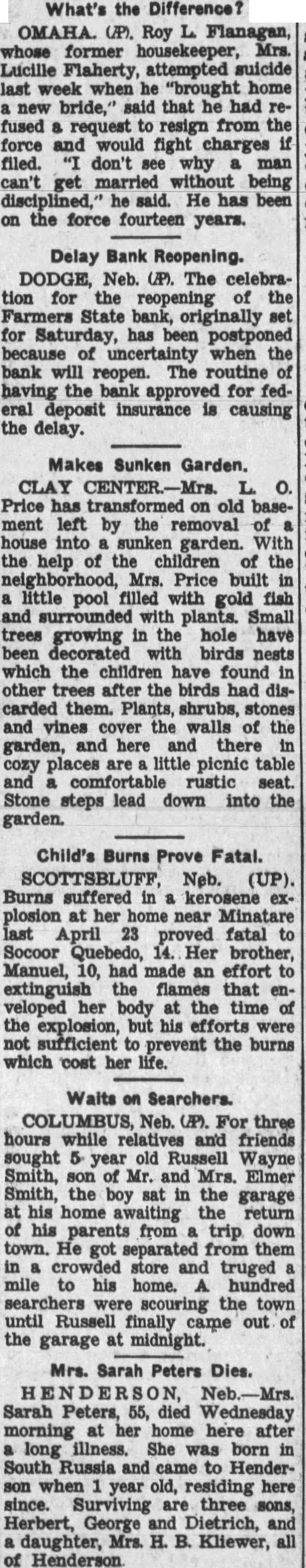 H N D E Neb.-Mrs. Sarah Peters, 55, died Wednesday morning at her home here after a long illness. She was born in South Russia and came to Henderson when year old, residing here since. Surviving are three sons, Herbert, George and Dietrich, and a daughter, Mrs. H. B. Kliewer, all of Henderson