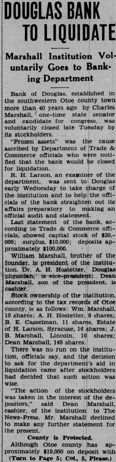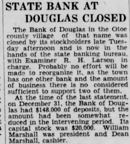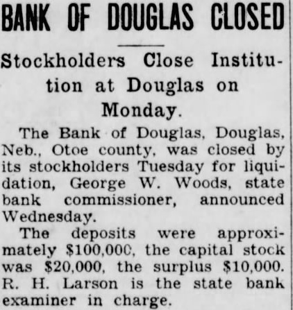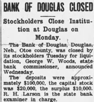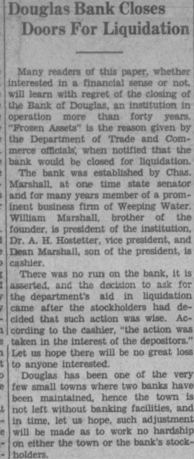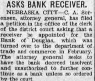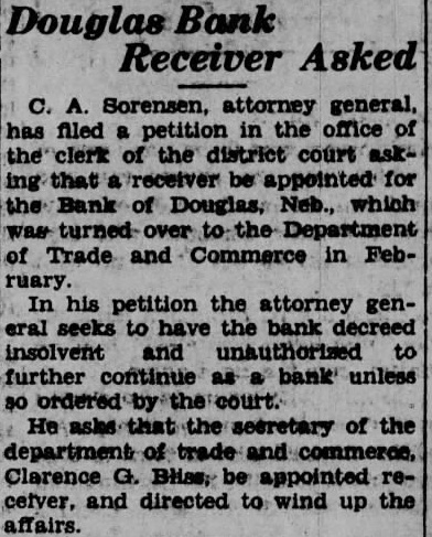 Bank Receiver Files Report. Clarence E. Bliss, receiver of the Bank of Douglas, has filed in the district court detailed report of cash receipts and disbursements and disposition assets and liabilities covering the receivership of the bank from August 11, 1930, to April 23, 1931.