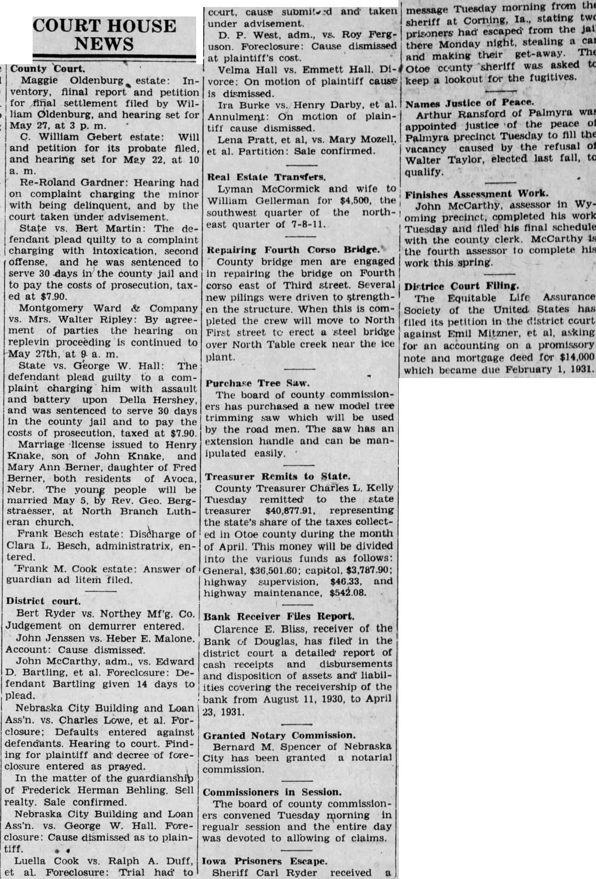 County Court. Maggie Oldenburg, estate: Inventory, fiinal report and petition for final settlement filed by William Oldenburg, and hearing set for William Gebert estate: Will and petition for its probate filed, and hearing set for May 22, at 10 Re-Roland Gardner: Hearing had on complaint charging the minor with being delinquent, and by the court taken under advisement State Bert Martin: The defendant plead quilty to complaint charging with intoxication, second offense, and he was sentenced to serve 30 days in the county jail and to pay the costs of prosecution, taxat Montgomery Ward & Company vs. Mrs. Walter Ripley By agreement of parties the hearing on replevin proceeding is continued to May 27th, at State vs. George W. Hall: The defendant plead guilty to complaint charging him with assault and battery upon Della Hershey, and sentenced to serve 30 days in the county jail and to pay the costs of prosecution, taxed at $7.90 Marriage license issued to Henry Knake, son of John Knake, and Mary Ann Berner, daughter of Fred Berner, residents of Avoca, Nebr The young people will be married May Rev. Geo Bergstraesser, at North Branch Lutheran church. Frank Besch estate: Discharge of Clara L. Besch, administratrix, enFrank M. Cook estate: Answer of guardian ad litem filed.
