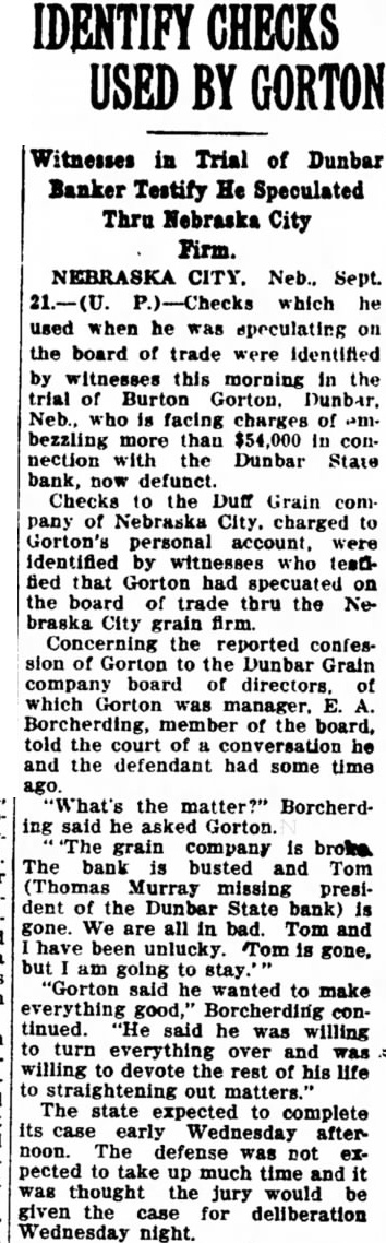 Witnesses in Trial of Dunbar Banker Testify He Speculated Thru Nebraska City Firm. NEBRASKA CITY. Neb., Sept. which used when he was speculating the board of trade were Identified by witnesses this morning in the trial of Burton Gorton. Dunbar. who facing charges of bezzling more than connection with the Dunbar State defunct. Checks the Duff Grain com pany of Nebraska City, Gorton's were identified witnesses teath fied that had specuated on the board trade thru the NeCity grain firm. Concerning the reported confession Gorton the Dunbar Grain board of directors, which of the board, told the court of he and the defendant had some time the Borcherding said he asked Gorton. grain company broke The bank busted and Tom Murray missing president the Dunbar State bank) gone. We all bad Tom have been unlucky. gone, going "Gorton he wanted to make good,' Borcherding continued. said he was willing turn and willing devote the rest of life straightening out The state to complete its case early Wednesday afternoon. The defense not pected to take up much time and thought the jury would given case for deliberation Wednesday night.