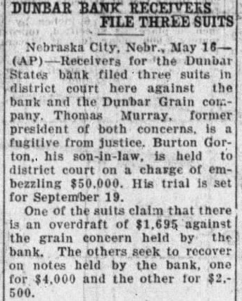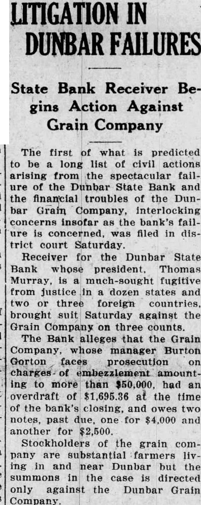 The first of what is predicted to be long list civil actions arising from the spectacular failure the Dunbar State Bank and the financial troubles of the Dunbar Grain Company, interlocking concerns insofar as the bank's failure is concerned, was filed in district court Saturday Receiver for the Dunbar State Bank whose president. Thomas Murray, is a much-sought fugitive from justice in dozen states and two or three foreign countries. brought suit Saturday against the Grain Company on three counts. The Bank alleges that the Grain Company, whose manager Burton Gorton faces prosecution on charges. embezzlement amounting to more than had an overdraft of $1,695.36 at the time of the bank's closing, and owes two notes, past due, one for $4,000 and another for $2,500. Stockholders of the grain company are substantial farmers living in and near Dunbar but the summons in the case is directed only against the Dunbar Grain Company.