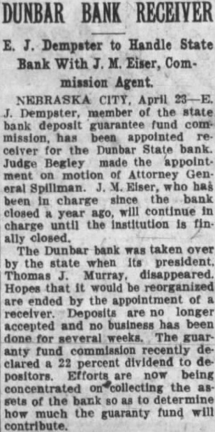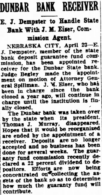 E. J. Dempster to Handle State Bank With J. M. Eiser, Commission Agent. NEBRASKA CITY, April 23-E. J. Dempster, member of the state bank deposit guarantee fund commission, has been appointed receiver for the Dunbar State bank. Judge Begley made the appointment on motion of Attorney General Spillman. J. M. Eiser, who has been in charge since the bank closed year ago, will continue in charge until the institution is finally closed. The Dunbar bank was taken over by the state when its president. Thomas Murray, disappeared. Hopes that it would be reorganized are ended by the appointment of receiver. Deposits are no longer accepted and no business has been done for several weeks. The guar anty fund commission recently declared a 22 percent dividend to depositors. Efforts are now being concentrated the as sets of the bank so as to how much the guaranty fund will contribute.