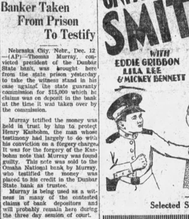 Murray tetified the money was held in trust by him to protect Henry Kashohm, the man whose testimony had largely to do with his conviction on forgery charges was for the forgery of the Kasbohm note that Murray was found guilty. This note was sold to the Omaha National bank by Murray, who testified the money placed to his credit in the Dunbar State bank as trustee: Murray is being used as witness in many of the contested claims of bank depositors and will probably remain here during the three day session of court.