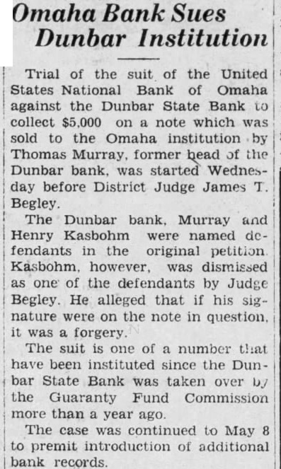 Trial of the suit of the United States National Bank of Omaha against the Dunbar State Bank to collect $5,000 on a note which was sold to the Omaha institution by Thomas Murray, former head of the Dunbar bank. was started Wednesday before District Judge James T. Begley. The Dunbar bank, Murray and Henry Kasbohm were named defendants in the original petition Kasbohm. however, was dismissed as one of the defendants by Judge Begley. He alleged that if his signature were on the note in question. it was forgery. The suit is one of a number that have been instituted since the Dunbar State Bank was taken over by the Guaranty Fund Commission more than year ago. The case was continued to May 8 to premit introduction of additional bank records.