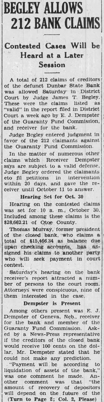 Among others present was E. Dempster of Geneva, Neb., receiver for the bank and member of the Guaranty Fund Commission Asked by representative the creditors of the closed bank would receive 100 cents on the lar. Mr. Dempster stated that he could not make any prediction. "Payment will be according to liquidation of assets of the bank," was one comment he made. Another comment was that "the amount of recovery of depositors will depend on the future of the (Turn to Page 2; Col. Please)