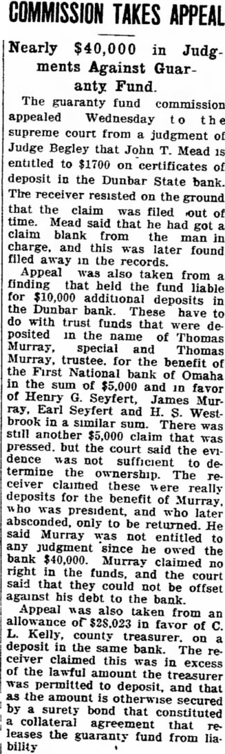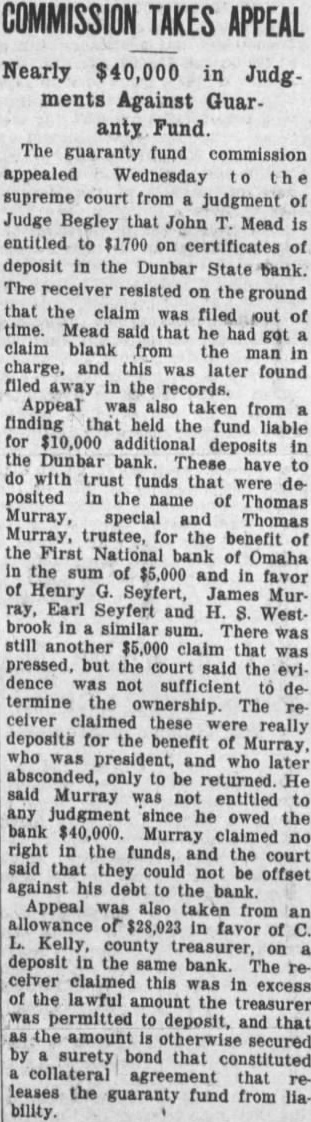Nearly $40,000 in Judg ments Against Guaranty Fund. The guaranty fund commission appealed Wednesday supreme court from judgment of Judge Begley that John T. Mead is entitled to $1700 on certificates of deposit in the Dunbar State bank. The receiver resisted on the ground that the claim was filed out of Mead said that he got claim blank from the man in charge, and this was found filed in the Appeal also taken from a finding that held the fund liable for $10,000 additional deposits in the Dunbar These have to do with trust funds that were deposited in the name of Thomas Murray, special and Thomas Murray, trustee, the benefit of the First of Omaha in the sum of $5,000 and in favor of Henry Seyfert, James Murray, Earl Seyfert and H. S. Westbrook in similar There was still another $5,000 claim that was pressed, but the court said the evidence was not sufficient determine the ownership. The receiver claimed these really deposits for the benefit of Murray, who was president, and who later absconded, only to be returned. He said Murray was not entitled to judgment since he owed the bank $40,000. Murray claimed no right in the funds, and the court said that they could not offset against his debt the bank. Appeal was also from an allowance of $28,023 in favor of L. Kelly, county treasurer, on deposit in the same bank. The recelver claimed this was in excess of the lawful amount the treasurer was permitted to deposit, and that the amount is otherwise secured by surety bond that constituted collateral agreement that leases the guaranty fund from