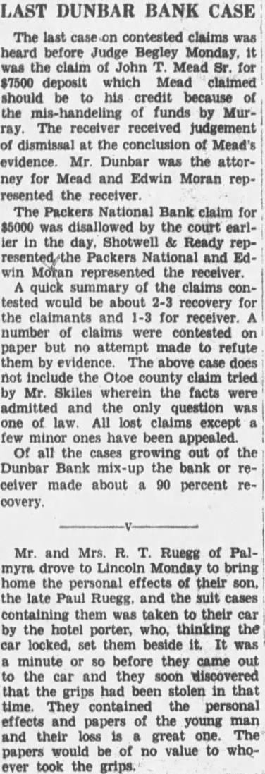 The last case on contested claims was heard before Judge Begley Monday. it was the claim of John T. Mead Sr. for $7500 deposit which Mead claimed should be to his credit because of the mis-handeling of funds by Murray. The receiver received judgement of dismissal at the conclusion of Mead's evidence. Mr. Dunbar was the attorney for Mead and Edwin Moran represented the receiver. The Packers National Bank claim for $5000 was disallowed by the court earller in the day, Shotwell & Ready represented the Packers National and Edwin Moran represented the receiver. A quick summary of the claims contested would be about 2-3 recovery for the claimants and 1-3 for receiver. A number of claims were contested on paper but no attempt made to refute I. Scott, them by evidence. The above case does Smith. not include the Otoe county claim tried Towle, g by Mr. Skiles wherein the facts were admitted and the only question was one of law. All lost claims except a few minor ones have been appealed. Of all the cases growing out of the Dunbar Bank mix-up the bank or receiver made about a 90 percent recovery.