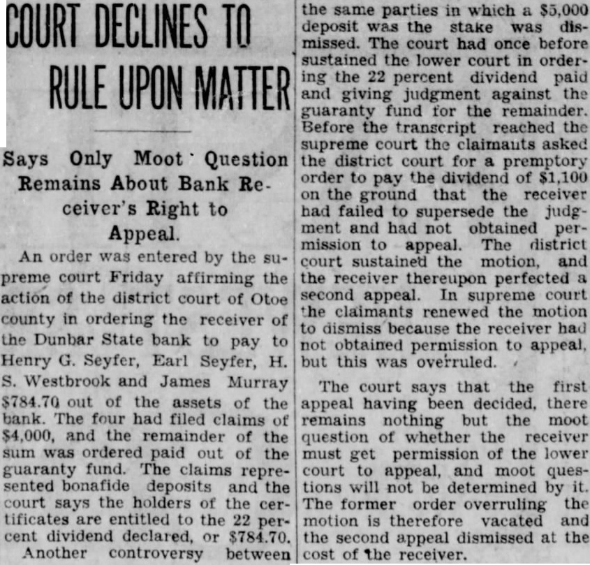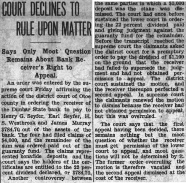 Says Only Moot Question Remains About Bank Receiver's Right to Appeal An order was entered by the supreme court Friday affirming the action of the district court of Otoe county in ordering the receiver of the Dunbar State bank to pay to Henry G. Seyfer, Earl Seyfer, H. S. Westbrook and James Murray $784.70 out of the assets of the bank. The four had filed claims of $4,000, and the remainder of the sum was ordered paid out of the guaranty fund. The claims represented bonafide deposits and the court says the holders of the certificates are entitled to the 22 percent dividend declared, or $784.70. Another controversy between the same parties in which a $5,000 deposit was the stake was dismissed. The court had once before sustained the lower court in ordering the 22 percent dividend paid and giving judgment against the guaranty fund for the remainder. Before the transcript reached the supreme court the claimants asked the district court for a premptory order to pay the dividend of $1,100 on the ground that the receiver had failed to supersede the judgment and had not obtained permission to appeal. The district court sustained the motion, and the receiver thereupon perfected second appeal. In supreme court the claimants renewed the motion to dismiss because the receiver had not obtained permission to appeal, but this was overruled.