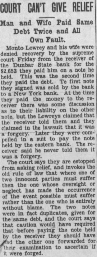 Monto Lowrey and his wife were denied recovery by the supreme court Friday from the receiver of the Dunbar State bank for the $2,652 they paid him on a note he held. This was the second time they paid the debt. Te first note they signed was sold by the bank to New York bank. At the time they paid the money to the receiver there was some discussion as to their liability on the other note, but the Lowreys claimed that the receiver told them and they claimed in the lawsuit that it was a forgery. Later they were compelled in suit to pay the note held by the eastern bank. The receiver said he never told them it was forgery. The court says they are estopped from asking relief, and invokes the old rule of law that where one of two innocent parties must suffer then the one whose oversight or neglect has made the occurrence of the event possible must suffer rather than the one who is entirely without blame. The two notes were in fact duplicates, given for the same debt, and the court says that caution would have required that before paying the note held by the receiver they should have had the other one forwarded for their examination to ascertain if it were forged.