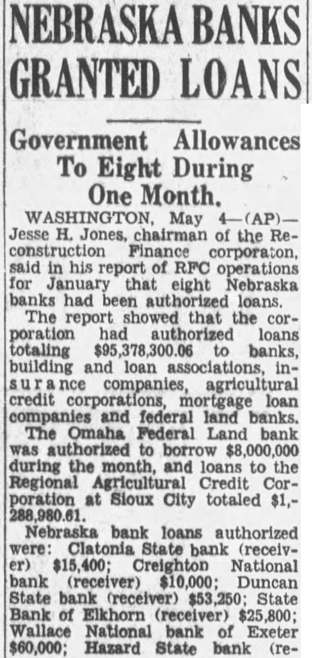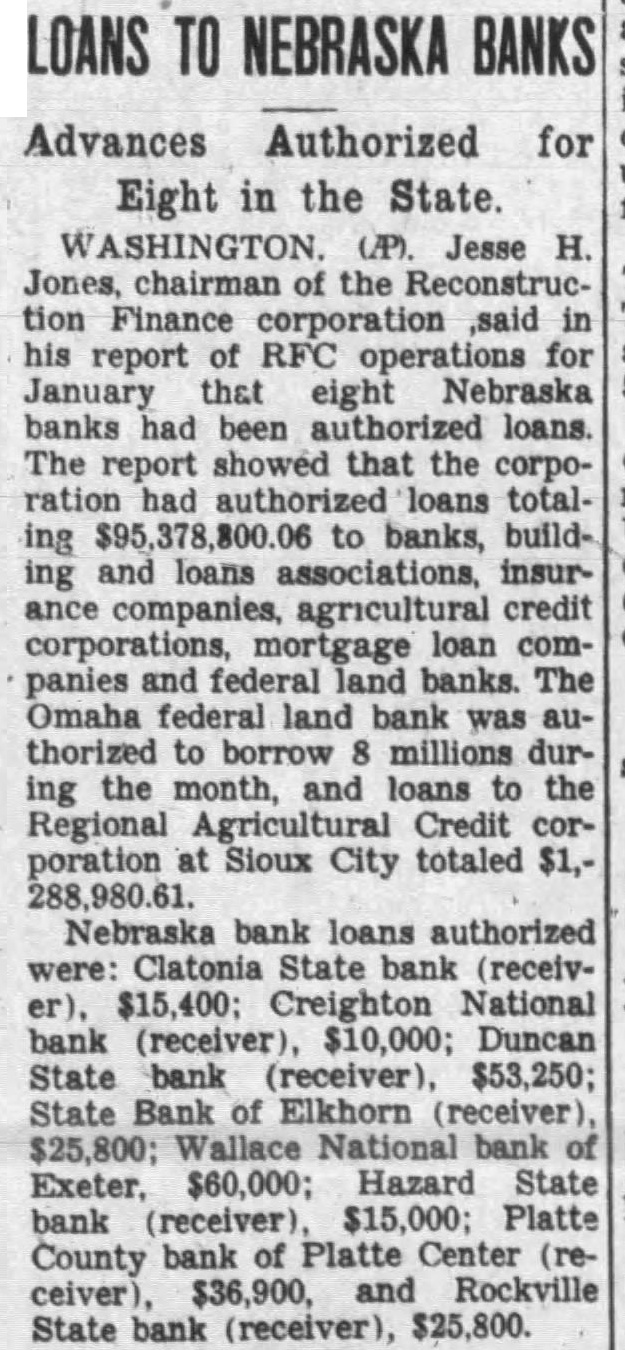 NEBRASKA BANKS Advances Authorized for Eight in the State. WASHINGTON. (AP). Jesse H. Jones, the tion Finance said report RFC January that eight Nebraska banks had been authorized loans. The report showed the ration had authorized to banks, buildand loans associations, insurcompanies, agricultural credit corporations, loan panies federal land banks. The Omaha federal land bank was thorized borrow millions month, and the Regional Agricultural Credit poration at Sioux totaled Nebraska bank loans authorized State bank (receiv$15,400; Creighton National (receiver), $10,000; Duncan State (receiver), $53,250; State Bank Elkhorn (receiver), $60,000; Hazard State Platte County Platte Center (reand State bank (receiver),