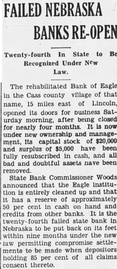 FAILED NEBRASKA BANKS RE-OPEN Twenty-fourth In State to Be Recognized Under New Law. The rehabilitated Bank of Eagle in the Cass county village of that name, 15 miles east of Lincoln, opened its doors for business Saturday morning, after being closed for nearly four months. It is now under new ownership and management, its capital stock of $20,000 and surplus of $5,000 have been fully resubscribed in cash, and all bad and doubtful assets nave been removed. State Bank Commissioner Woods announced that the Eagle institution is entirely cleaned up and that it has a reserve of approximately 50 per cent in cash on hand and credits from other banks. It is the twenty- failed state bank in Nebraska to be put back on its feet within nine months under the new law permitting compromise settlements to be made when depositors holding 85 per cent of all claims consent thereto.