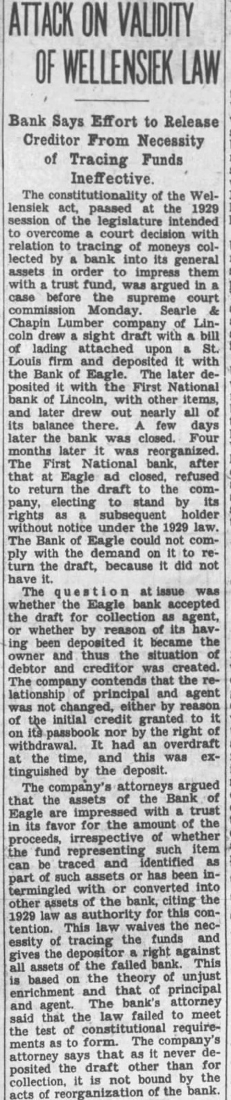 VALIDITY WELLENSIEK Bank Says Effort to Release Creditor From Necessity of Tracing Funds the Wellensiek act, passed the 1929 session of the to with relation of collected bank into its assets order to them trust fund, was argued in before Searle Chapin Lindrew sight draft with bill lading St. and deposited with the Bank Eagle. The later posited with First National Lincoln, with other items, and later drew out nearly all its there. days later the bank was closed. months later reorganized. The First after ad refused return draft the comelecting its pany, holder without notice under the 1929 law. Bank Eagle could not comply with the demand on turn the draft, because it did not The issue was whether the Eagle bank accepted the draft for collection as agent, or whether by reason its havbeen became the owner and thus the situation debtor creditor created. company contends that lationship principal and agent changed, either by of the initial credit granted to nor the right withdrawal. had overdraft and extinguished by the deposit. attorneys argued assets of the Bank that the impressed with trust Eagle are favor for the amount of the of whether proceeds, irrespective representing such item the traced and identified can of assets or has part termingled converted of the citing the other assets authority for this con1929 law This law the nectention. of the funds and essity tracing against gives the failed bank. This assets based the theory of unjust on that principal enrichment The attorney and agent. law failed to meet that the of requiretest form. The ments that never attorney says other than for posited the by the not of the bank.