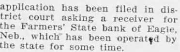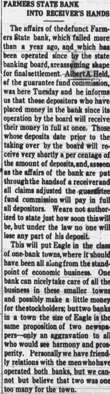 FARMERS STATE BANK INTO RECEIVER'S HANDS The affairs of thedefunct Farmers State bank, which failed more than a year ago, and which has been operated since by the state banking board, areassuming shape for finalsettlement. Held, of the guarantee fund commission, was here Tuesday and he informs us that those depositors who have placed money in the bank since its operation by the board will receive their money in full at once. Those whose deposits date prior to the taking over by the board will receive very shortly a per centage of the amount of deposits, and, asseon as the affairs of the bank are put throughthe handsof a receiverand all claims adjusted the guaratitee fund commission will pay in full all depositors. Weare not authorized to state just how soon thiswill be, but under the law no one will lose any part of his deposit. This will put Eagle in the class of one-bank towns, where it should have been all alongfrom the standpoint of economic business. One bank can nicelytake care of all the business in these smaller towns and possibly make a little money for thestockholders; buttwo banks in a town the size of Eagle is the same proposition of two newspapers-only an aggravation to all who would see harmony and prosperity. Personally we have friendly relations with the menwhohave operated both banks, but we cannot but believe that two was one too many for the town.