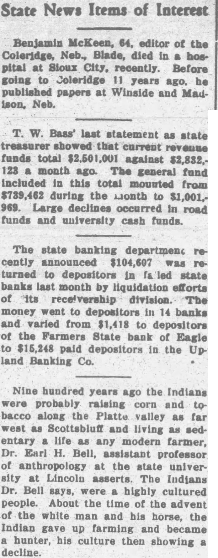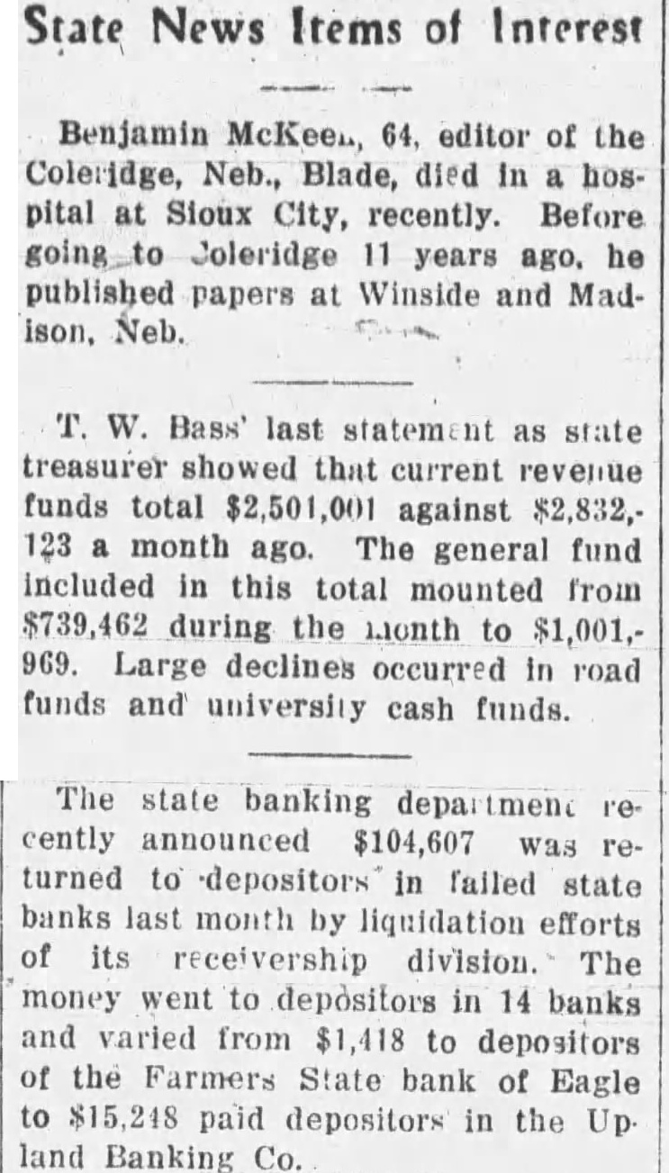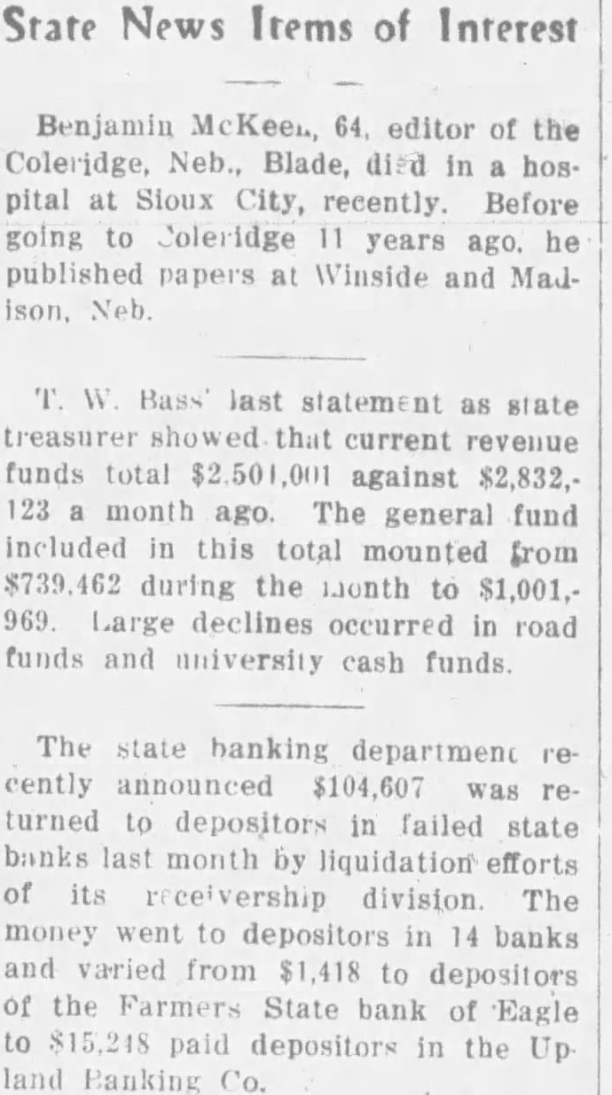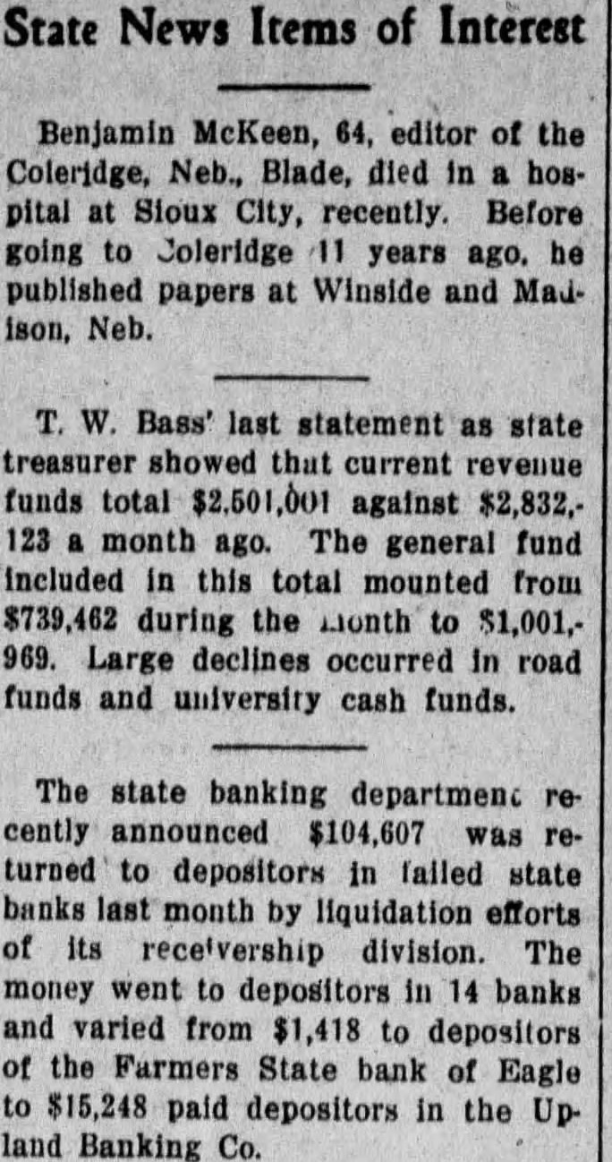 Items of Interest Benjamin McKeen, editor of the Coleridge, Neb., Blade, died in hospital Sioux City, recently. Before going to Coleridge years ago, he published papers Winside and Madison, Neb. Bass' statement treasurer showed that current revenue funds total against $2,832.month ago. The general fund included this total mounted from $739,462 during the Month to $1,001,969. Large declines occurred in road funds and university cash funds. The state banking department cently announced $104,607 was turned depositors in failed state banks liquidation efforts of its rece'vership division. The money went depositors in banks and varied from $1,418 depositors the Farmers State bank of Eagle $15,248 paid depositors the Upland Banking Co.