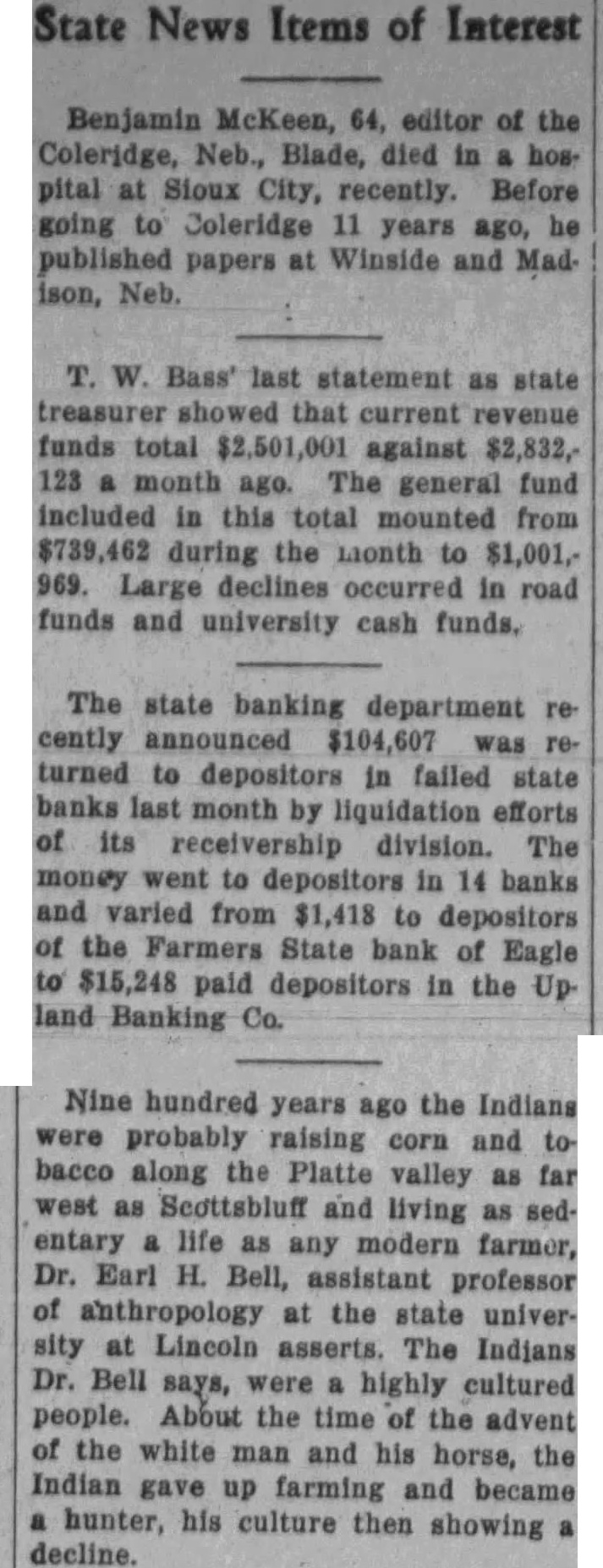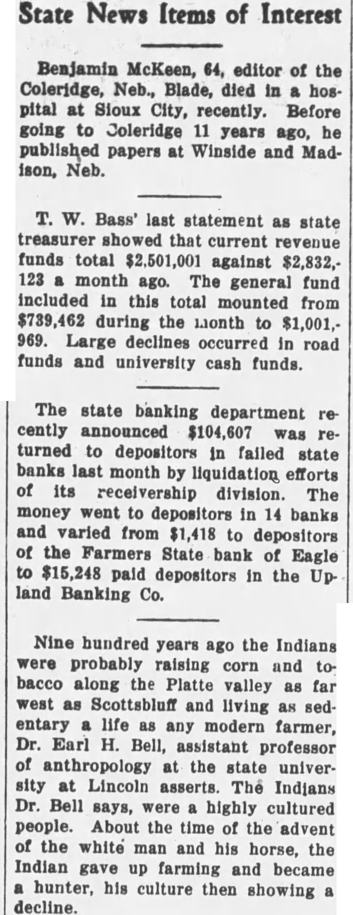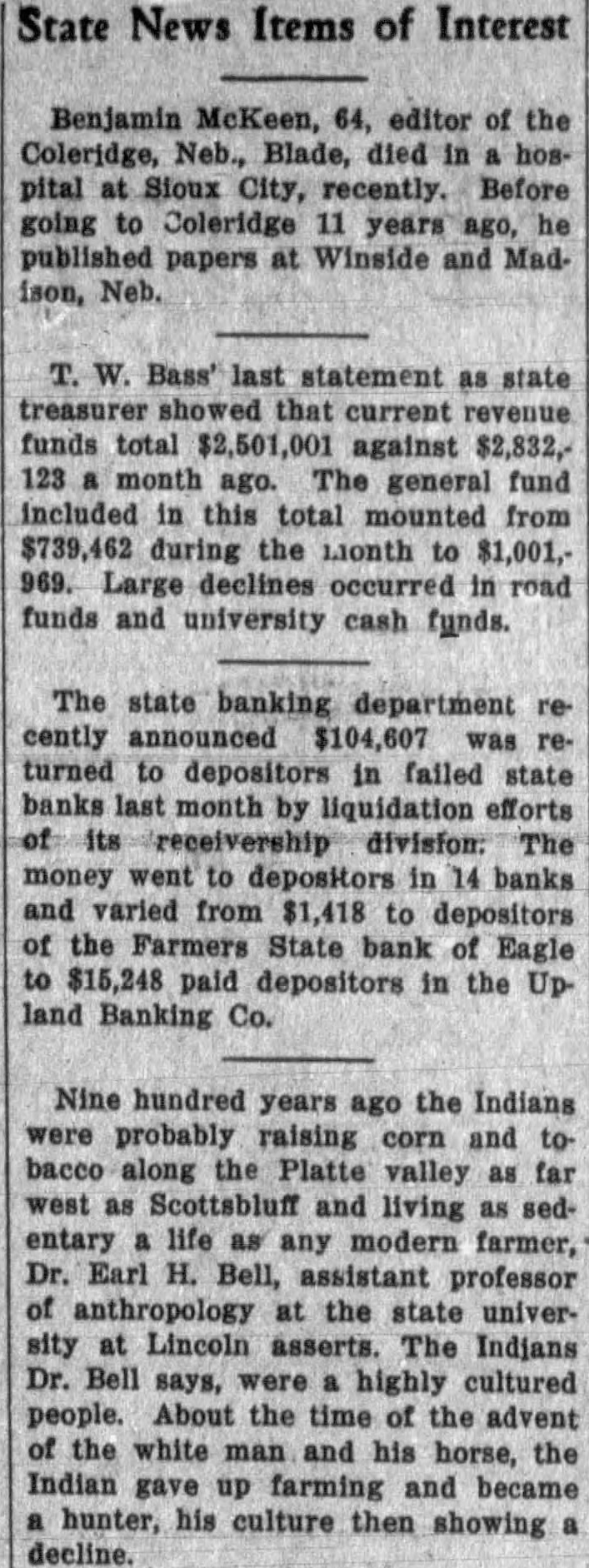 Items of Interest Benjamin McKeen, editor of the Coleridge, Neb., Blade, died in hospital Sioux City, recently. Before going to Coleridge years ago, he published papers Winside and Madison, Neb. Bass' statement treasurer showed that current revenue funds total against $2,832.month ago. The general fund included this total mounted from $739,462 during the Month to $1,001,969. Large declines occurred in road funds and university cash funds. The state banking department cently announced $104,607 was turned depositors in failed state banks liquidation efforts of its rece'vership division. The money went depositors in banks and varied from $1,418 depositors the Farmers State bank of Eagle $15,248 paid depositors the Upland Banking Co.