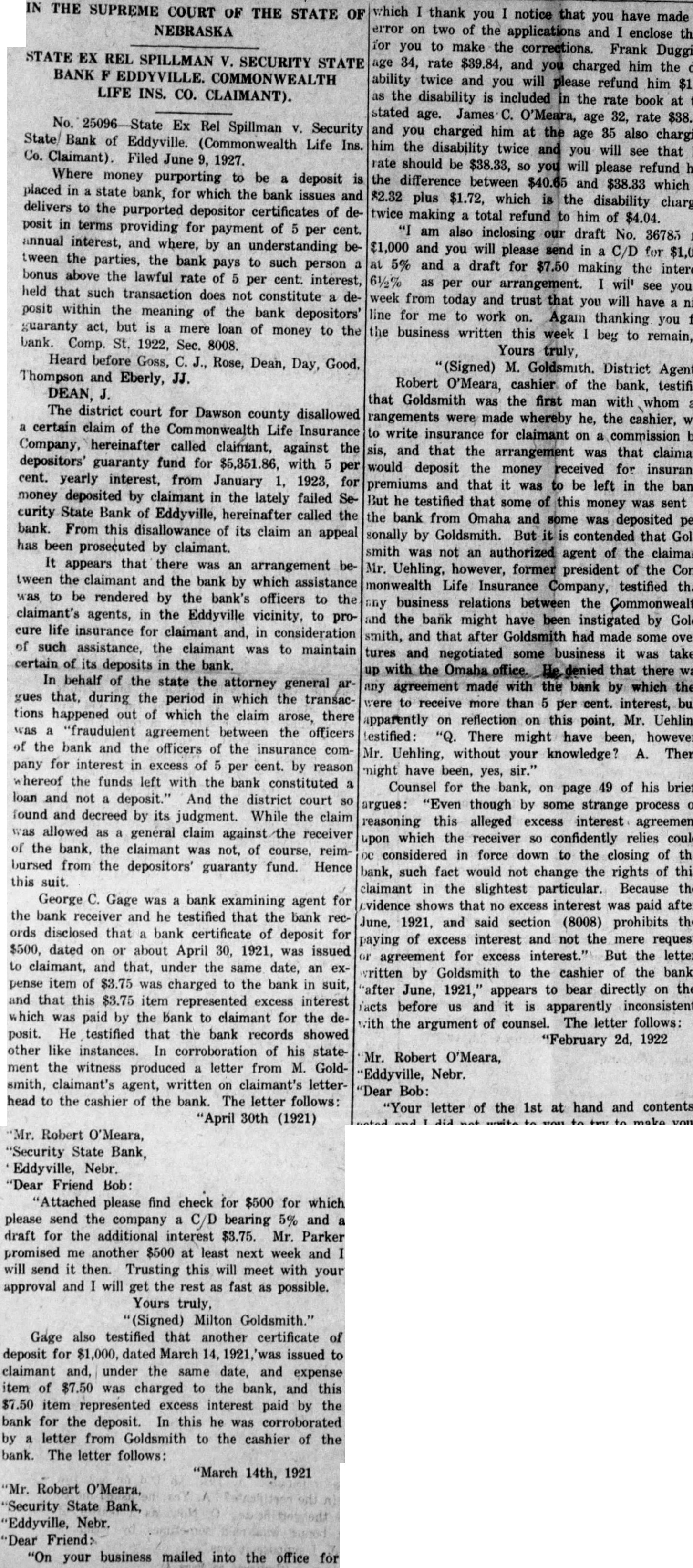 IN THE SUPREME COURT OF THE STATE OF NEBRASKA for you to make the corrections. Frank Duggins, STATE EX REL SPILLMAN V. SECURITY STATE age 34, rate $39.84, and you charged him the disBANK F EDDYVILLE. COMMONWEALTH ability twice and you will please refund him $1.78 LIFE INS. CO. CLAIMANT). as the disability is included in the rate book at the stated age. James C. O'Meara, age 32, rate $38.33, No. 25096-State Ex Rel Spillman V. Security and you charged him at the age 35 also charging State/ Bank of Eddyville. (Commonwealth Life Ins. him the disability twice and you will see that his Co. Claimant). Filed June 9, 1927. rate should be $38.33, so you will please refund him Where money purporting to be a deposit is the difference between $40.65 and $38.33 which is placed in a state bank, for which the bank issues and $2.32 plus $1.72, which is the disability charged delivers to the purported depositor certificates of detwice making a total refund to him of $4.04. posit in terms providing for payment of 5 per cent. "I am also inclosing our draft No. 36783 for annual interest, and where, by an understanding be$1,000 and you will please send in a C/D for $1,000 tween the parties, the bank pays to such person a at 5% and a draft for $7.50 making the interest bonus above the lawful rate of 5 per cent. interest, 61/2% as per our arrangement. I will see you a held that such transaction does not constitute a deweek from today and trust that you will have a nice posit within the meaning of the bank depositors' line for me to work on. Again thanking you for guaranty act, but is a mere loan of money to the the business written this week I beg to remain, bank. Comp. St. 1922, Sec. 8008. Yours truly, Heard before Goss, C. J., Rose, Dean, Day, Good. "(Signed) M. Goldsmith. District Agent." Thompson and Eberly, JJ. Robert O'Meara, cashier of the bank, testified DEAN, J. that Goldsmith was the first man with whom arThe district court for Dawson county disallowed rangements were made whereby he, the cashier, was a certain claim of the Commonwealth Life Insurance to write insurance for claimant on a commission baCompany, hereinafter called claimant, against the sis, and that the arrangement was that claimant depositors' guaranty fund for $5,351.86, with 5 per would deposit the money received for insurance cent. yearly interest, from January 1, 1923, for premiums and that it was to be left in the bank. money deposited by claimant in the lately failed SeBut he testified that some of this money was sent to curity State Bank of Eddyville, hereinafter called the the bank from Omaha and some was deposited perbank. From this disallowance of its claim an appeal sonally by Goldsmith. But it is contended that Goldhas been prosecuted by claimant. smith was not an authorized agent of the claimant It appears that there was an arrangement beMr. Uehling, however, former president of the Comtween the claimant and the bank by which assistance monwealth Life Insurance Company, testified that was to be rendered by the bank's officers to the any business relations between the Commonwealth claimant's agents, in the Eddyville vicinity, to proand the bank might have been instigated by Goldcure life insurance for claimant and, in consideration smith, and that after Goldsmith had made some overof such assistance, the claimant was to maintain tures and negotiated some business it was taken certain of its deposits in the bank. up with the Omaha office. He denied that there was In behalf of the state the attorney general arany agreement made with the bank by which they gues that, during the period in which the transacwere to receive more than 5 per cent. interest, but, tions happened out of which the claim arose, there apparently on reflection on this point, Mr. Uehling was a "fraudulent agreement between the officers lestified: "Q. There might have been, however, of the bank and the officers of the insurance comMr. Uehling, without your knowledge? A. There pany for interest in excess of 5 per cent. by reason might have been, yes, sir." whereof the funds left with the bank constituted a Counsel for the bank, on page 49 of his brief, loan and not a deposit." And the district court so argues: "Even though by some strange process of found and decreed by its judgment. While the claim reasoning this alleged excess interest agreement was allowed as a general claim against the receiver upon which the receiver so confidently relies could of the bank, the claimant was not, of course, reimDC considered in force down to the closing of the bursed from the depositors' guaranty fund. Hence bank, such fact would not change the rights of this this suit. claimant in the slightest particular. Because the George C. Gage was a bank examining agent for evidence shows that no excess interest was paid after the bank receiver and he testified that the bank recJune, 1921, and said section (8008) prohibits the ords disclosed that a bank certificate of deposit for paying of excess interest and not the mere request $500, dated on or about April 30, 1921, was issued or agreement for excess interest." But the letter to claimant, and that, under the same date, an exvritten by Goldsmith to the cashier of the bank, pense item of $3.75 was charged to the bank in suit, "after June, 1921," appears to bear directly on the and that this $3.75 item represented excess interest facts before us and it is apparently inconsistent which was paid by the bank to claimant for the dewith the argument of counsel. The letter follows: posit. He testified that the bank records showed "February 2d, 1922 other like instances. In corroboration of his stateMr. Robert O'Meara, ment the witness produced a letter from M. Gold"Eddyville, Nebr. smith, claimant's agent, written on claimant's letter"Dear Bob: head to the cashier of the bank. The letter follows: "Your letter of the 1st at hand and contents "April 30th (1921)