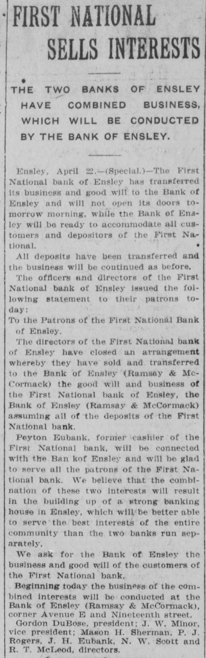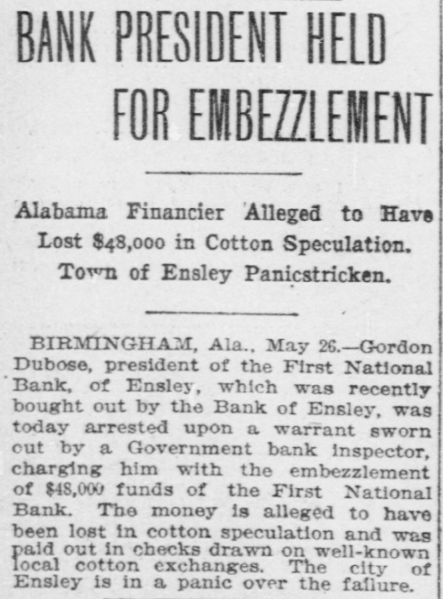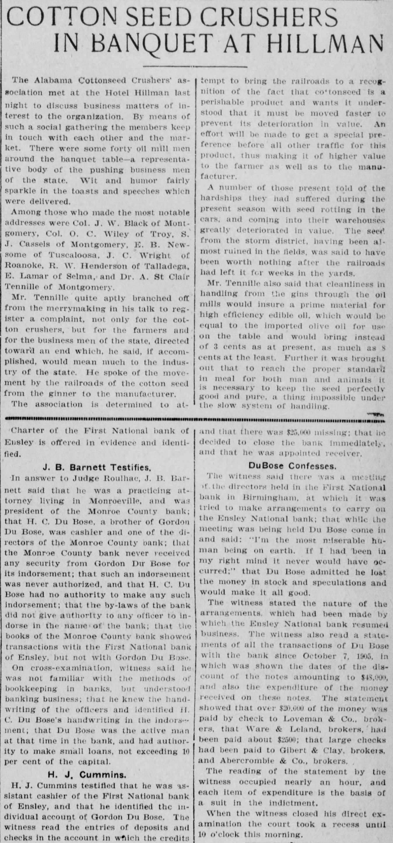 COTTON SEED CRUSHERS IN BANQUET AT HILLMAN The Alabama Cottonseed Crushers' astempt to bring the railroads to a recognition of the fact that co'tonseed is a sociation met at the Hotel Hillman last perishable product and wants it undernight to discuss business matters of instood that it must be moved faster to terest to the organization. By means of prevent its deterioration in value. An such a social gathering the members keep effort will be made to get a special prein touch with each other and the marference before all other traffic for this ket. There were some forty oil mill men product, thus making it of higher value around the banquet table-a representato the farmer as well as to the manutive body of the pushing business men facturer. of the state. Wit and humor fairly A number of those present told of the sparkle in the toasts and specches which hardships they had suffered during the were delivered. present season with seed rotting in the Among those who made the most notable cars, and coming into their warehouses addresses were Col. J. W. Black of Montgreatly deteriorated in value. The seed gomery, Col. O. C. Wiley of Troy, S. from the storm district, having been alJ. Cassels of Montgomery, E. B. Newmost ruined in the fields, was said to have some of Tuscaloosa, J. C. Wright of been worth nothing after the railroads Roanoke, R. W. Henderson of Talladega, had left it for weeks in the yards. E. Lamar of Selma, and Dr. A. St Clair Mr. Tennille also said that cleanliness in Tennille of Montgomery handling from the gins through the oil Mr. Tennille quite aptly branched off mills would insure a prime material for from the merrymaking in his talk to reghigh efficiency edible oil, which would be ister a complaint, not only for the cotequal to the imported olive oil for use ton crushers, but for the farmers and on the table and would bring instead for the business men of the state, directed of 3 cents as at present, as much as 8 toward an end which, he said, if accomcents at the least. Further it was brought plished, would mean much to the indusout that to reach the proper standard try of the state. He spoke of the movein meal for both man and animals it ment by the railroads of the cotton seed is necessary to keep the seed perfectly from the ginner to the manufacturer. good and pure, a thing impossible under The association is determined to atthe slow system of handling. Charter of the First National bank of and that there was $25,000 missing: that he Ensley is offered in evidence and identidecided to close the bank Immediately, and that he was appointed receiver. fied. DuBose Confesses. J. B. Barnett Testifies, The witness said there was a meeting In answer to Judge Roulhac, J. B. Barthe directors held in the First National nett said that he was a practicing atbank in Birmingham, at which it was torney living in Monroeville, and was tried to make arrangements to carry on president of the Monroe County bank; the Ensley National bank: that while the that H. C. Du Bose, a brother of Gordon meeting was being held Du Bose come in Du Bose, was cashier and one of the diand said: "I'm the most miserable hurectors of the Monroe County bank; that man being on earth. If I had been in the Monroe County bank never received my right mind it never would have any security from Gordon Dir Bose for curred;" that Du Bose admitted he lost its indorsement; that such an indorsement the money in stock and speculations and was never authorized, and that H. C. Du would make it all good. Bose had no authority to make any such The witness stated the nature of the indorsement; that the by-laws of the bank arrangements, which had been made by did not give authority to any officer to inwhich the Ensley National bank resumed dorse in the name of the bank; that the business. The witness also read a statebooks of the Monroe County bank showed ments of all the transactions of Du Bose transactions with the First National bank with the bank since October 7, 1905, in of Ensley, but not with Gordon Du Base. which was shown the dates of the disOn cross-examination, witness said he count of the notes amounting to $43,000, was not familiar with the methods of and also the expenditure of the money bookkeeping in banks, but understood received on these notes. The statement banking business: that he knew the handshowed that over $20,000 of the money was writing of the officers and identified 11. paid by check to Loveman & Co., brokC. Du Bose's handwriting in the indorseers, that Ware & Leland, brokers, had ment; that Du Bose was the active man been paid about $2500; that large checks at that time in the bank, and had authorhad been paid to Gibert & Clay. brokers, ity to make small loans, not exceeding 10 and Abercrombie & Co., brokers. per cent of the capital. The reading of the statement by the H. J. Cummins. witness occupied nearly an hour, and H. J. Cummins testified that he was aseach item of expenditure is the basis of sistant cashier of the First National bank a suit in the indictment. of Ensley, and that he identified the inWhen the witness closed his direct exdividual account of Gordon Du Bose. The amination the court took a recess until witness read the entries of deposits and 10 o'clock this morning. checks in the account in which the credits