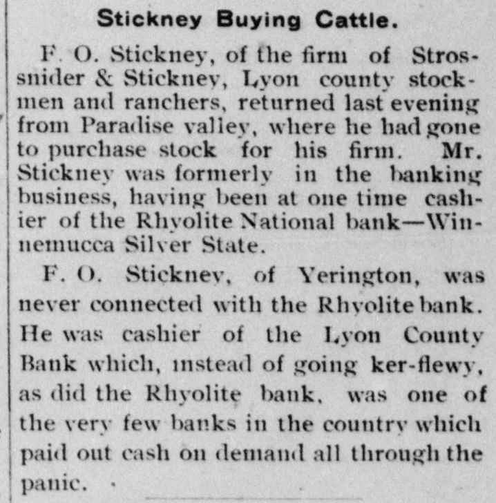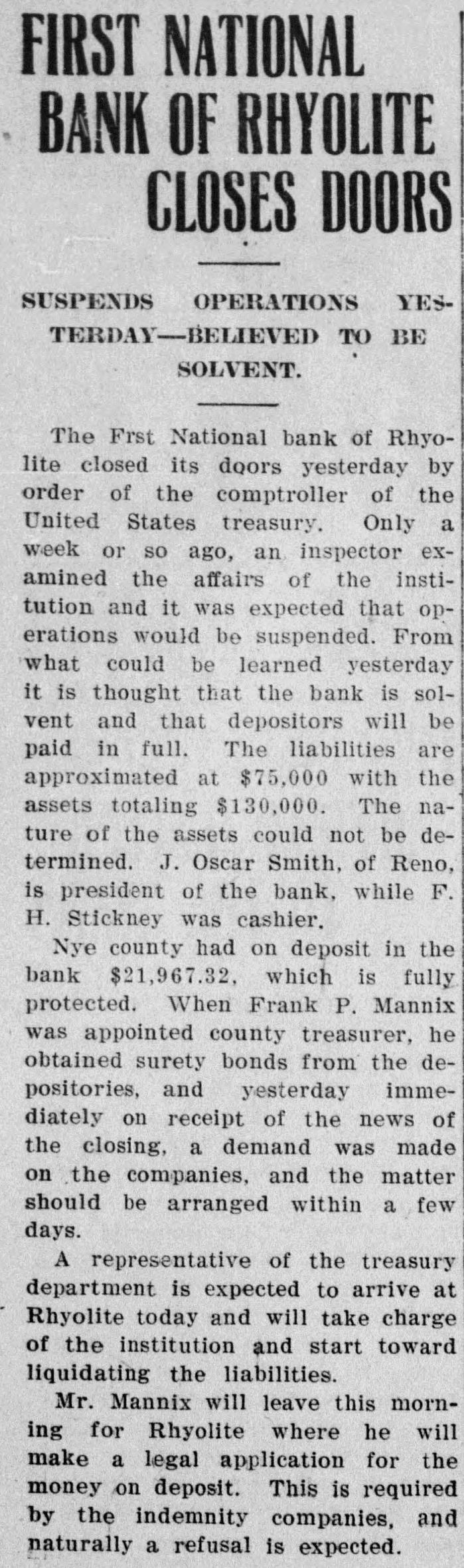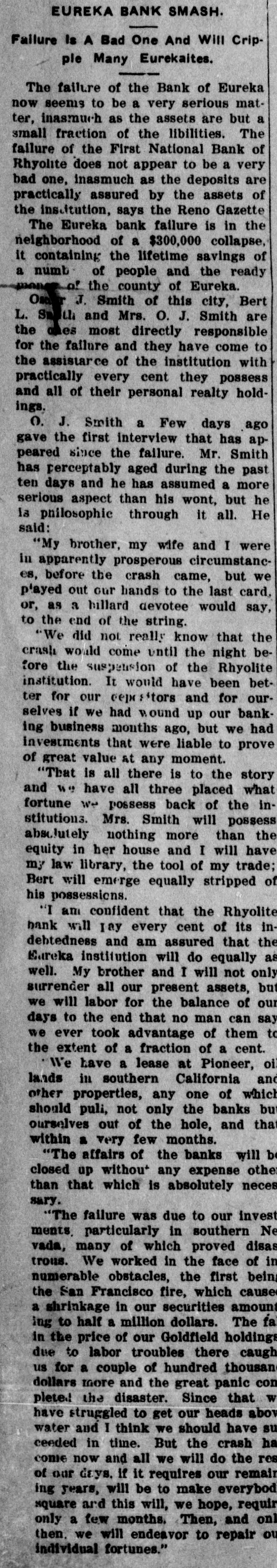 PEOPLE ASTOUNDED AT THE SMITHS' RASCALITY lands in southern California and other RENO, April 5.-The Gazette has properties, any one of which should the following on the Eureka bank pull, not only the banks but ourselves, failure: The failure of the Bank of and that within a very few months. Eureka now seems to be a very serious "The affairs of the banks will be matter, inasmuch as the assets are but closed up without expense other than a small fraction of the liabilities. The that which is absolutely necessary. failure of the First National Bank of The failure was due to our investRhyolite does not appear to be a very ments, particularly in southern Nebad one, inasmuch as the deposits are vada, many of which proved disaspractically assured by the assets of the trous. We worked in the face of ininstitution. numerable obstacles, the first being The Eureka bank failure is in the the San Francisco fire, which caused neighborhood of a $300,000 collapse, it a shrinkage in our securities amountcontaining the lifetime savings of a ing to half a million dollars. The fall number of people and the ready money in the price of our Goldfield holdings, of the county of Eureka. due to the labor troubles there, caught Osear J. Smith of this city, Bert L. us for a couple of bundred thousand Smith and Mrs. O. J. Smith are the dollars more and the great panic comones most directly responsible for the pleted the disaster. Since that we have failure and they have come to the struggled to get our heads above water assistance of the institution with pracand I think we should have succeeded tically every cent they possess and all in time. But the crash has come now of their personal realty holdings. and all we will do the rest of our days, O. J. Smith was seen by a Gazette if it requires our remaining years, will iepresentative this morning and was be to make everybody square, and this given the first interview that has apwill, we hope, require only a few t peared since the failure. Mr. Smith months. Then, and only then, we will has perceptably aged during the past endeavor to repair our individual forten days and he has assumed a more tunes. serious aspect than his wont, but he "I want to say this, that ! am in is philosophie through it all. He said: close touch with the banking institu"My brother, my wife and I were tions throughout the state and all of V in apparently prosperous circumstances them are in most prosperous condibefore the crash came, but we played L. tion, especially those of Reno, which out our hands to the last card, or, as o are as strong as the rock of Gibrala billiard devotee would say, to the tar. The First National Bank of Elko, end of the string. h with which my brother and myself We did not really know that the were once prominently connected, is crash, would come until the night beas solvent as any other banking instifore the suspension of the Rhyolite intution in Nevada. The Bank of Manstitution. It would have been better hattan, which we controlled has been for our depositors and for ourselves if liquidated without loss to a single inwe had wound up our banking business dividual. Nearly all accounts have months ago, but we had investments been paid and there 1S more than that were liable to prove of great value enough gold coin in the vaults to pay at any moment. everything that remains and then "That is all there is to the story and some." we have all three placed what forGeorge H. Taylor of the Washoe tune we possess back of the instituCounty Bank was asked what he knew tions. Mrs. Smith will possess absoregarding the suspension, inasmuch as lutely nothing more than the equity in he is interested in the Eureka Cattle her house and I will have my law company, one of the chief creditors of library, the tool of my trade; Bert will the institution, but he said that he had emerge equally stripped of his posses. not yet received any definite informasions. tion. "I am confident that the Rhyolite Moritz Sheeline was to have acceptbank will pay every cent of its ined the receivership of the institution, debtedness and am assured that the but he returned without reaching that Eureka institution will do equally as point, on account of the railroad well. My brother and I will not only washouts. He said that he intended surrender all our present assets, but to accept the receivership, but would we will labor for the balance of our now decline, because of the small stidays to the end that no man can say pend that was allowed, it being the we ever took advantage of them to intention to keep the cost of liquidation the extent of a fraction of a cent. to the very lowest possible amount. "We have a lease at Pioneer, oil