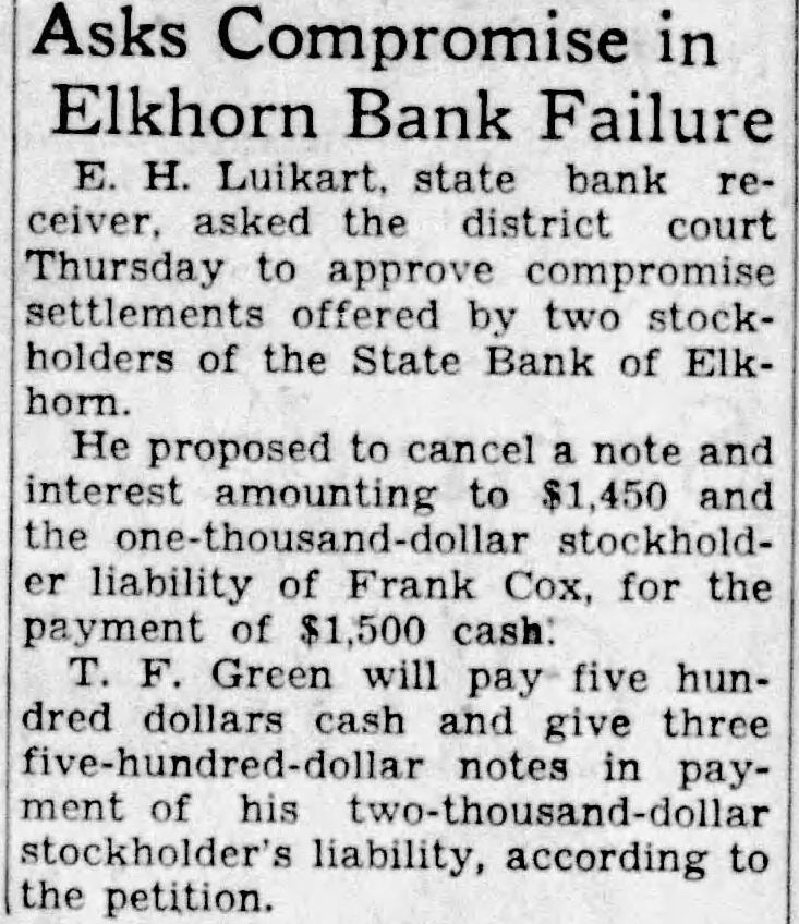 Asks Compromise in Elkhorn Bank Failure E. H. Luikart, state bank receiver, asked the district court Thursday to approve compromise settlements offered by two stockholders of the State Bank of Elkhorn. He proposed to cancel a note and interest amounting to $1,450 and the one-thousand-dollar stockholder liability of Frank Cox, for the payment of $1,500 cash: T. F. Green will pay five hundred dollars cash and give three five-hundred-dollar notes in payment of his two-thousand-dollar stockholder's liability, according to the petition.