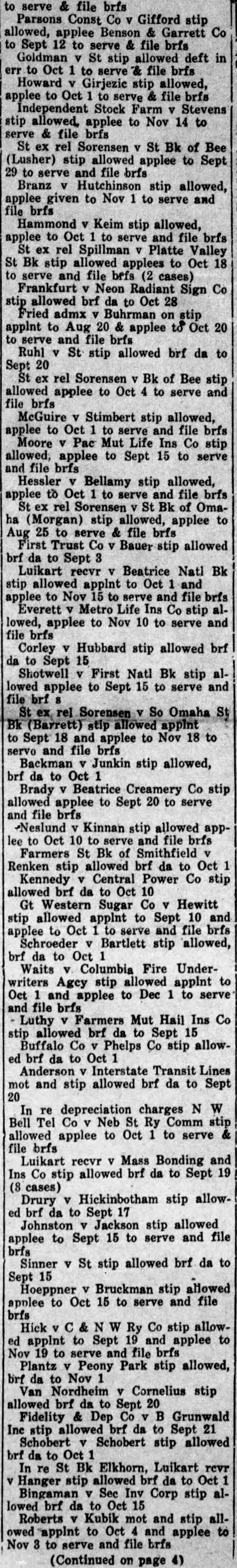 to serve & file brfs Parsons Const Co V Gifford stip allowed, applee Benson & Garrett Co to Sept 12 to serve & file brfs Goldman V St stip allowed deft in err to Oct 1 to serve & file brfs Howard V Girjezic stip allowed, applee to Oct 1 to serve & file brfs Independent Stock Farm V Stevens stip allowed, applee to Nov 14 to serve & file brfs St ex rel Sorensen V St Bk of Bee (Lusher) stip allowed applee to Sept 29 to serve and file brfs Branz V Hutchinson stip allowed, applee given to Nov 1 to serve and file brfs Hammond V Keim stip allowed, applee to Oct 1 to serve and file brfs St ex rel Spillman V Platte Valley St Bk stip allowed applees to Oct 18 to serve and file bffs (2 cases) Frankfurt V Neon Radiant Sign Co stip allowed brf da to Oct 28 Fried admx V Buhrman on stip applnt to Aug 20 & applee to Oct 20 to serve and file brfs Ruhl V St stip allowed brf da to Sept 20 St ex rel Sorensen V Bk of Bee stip allowed applee to Oct 4 to serve and file brfs McGuire V Stimbert stip allowed, applee to Oct 1 to serve and file brfs Moore V Pac Mut Life Ins Co stip allowed, applee to Sept 15 to serve and file brfs Hessler V Bellamy stip allowed, applee to Oct 1 to serve and file brfs St ex rel Sorensen St Bk of Omaha (Morgan) stip allowed, applee to Aug 25 to serve & file brfs First Trust Co V Bauer stip allowed brf da to Sept 3 Luikart recvr V Beatrice Natl Bk stip allowed applnt to Oct 1 and applee to Nov 15 to serve and file brfs Everett V Metro Life Ins Co stip allowed, applee to Nov 10 to serve and file brfs Corley V Hubbard stip allowed brf da to Sept 15 Shotwell V First Natl Bk stip allowed applee to Sept 15 to serve and file brf 8 St ex, rel Sorensen V So Omaha St Bk (Barrett) stip allowed appint to Sept 18 and applee to Nov 18 to servo and file brfs Backman V Junkin stip allowed, brf da to Oct 1 Brady V Beatrice Creamery Co stip allowed applee to Sept 20 to serve and file brfs *Neslund V Kinnan stip allowed applee to Oct 10 to serve and file brfs Farmers St Bk of Smithfield V Renken stip allowed brf da to Oct 1 Kennedy V Central Power Co stip allowed brf da to Oct 10 Gt Western Sugar Co V Hewitt stip allowed applnt to Sept 10 and applee to Oct 1 to serve and file brfs Schroeder V Bartlett stip allowed, brf da to Oct 1 Waits V. Columbia Fire Underwriters Agey stip allowed applnt to Oct 1 and applee to Dec 1 to serve and file brfs Luthy V Farmers Mut Hail Ins Co stip allowed brf da to Sept 15 Buffalo Co V Phelps Co stip allowed brf da to Oct 1 Anderson V Interstate Transit Lines mot and stip allowed brf da to Sept 20 In re depreciation charges N W Bell Tel Co V Neb St Ry Comm stip allowed applee to Oct 1 to serve & file brfs Luikart recvr V Mass Bonding and Ins Co stip allowed brf da to Sept 19 (8 cases) Drury V Hickinbotham stip allowed brf da to Sept 17 Johnston V Jackson stip allowed applee to Sept 15 to serve and file brfs Sinner V St stip allowed brf da to Sept 15 Hoeppner V Bruckman stip allowed applee to Oct 15 to serve and file brfs Hick V C & N W Ry Co stip allowed applnt to Sept 19 and applee to Nov 19 to serve and file brfs Plantz V Peony Park stip allowed, brf da to Nov 1 Van Nordheim V Cornelius stip allowed brf da to Sept 20 Fidelity & Dep Co V B Grunwald Inc stip allowed brf da to Sept 21 Schobert V Schobert stip allowed brf da to Oct 1 In re St Bk Elkhorn, Luikart revr V Hanger stip allowed brf da to Oct 1 Bingaman V Sec Inv Corp stip allowed brf da to Oct 15 Roberts V Kubik mot and stip allowed applnt to Oct 4 and applee to Nov 3 to serve and file brfs (Continued on page 4)