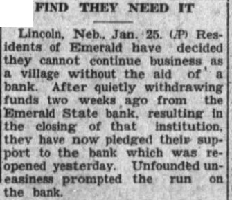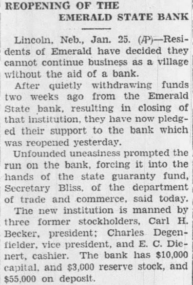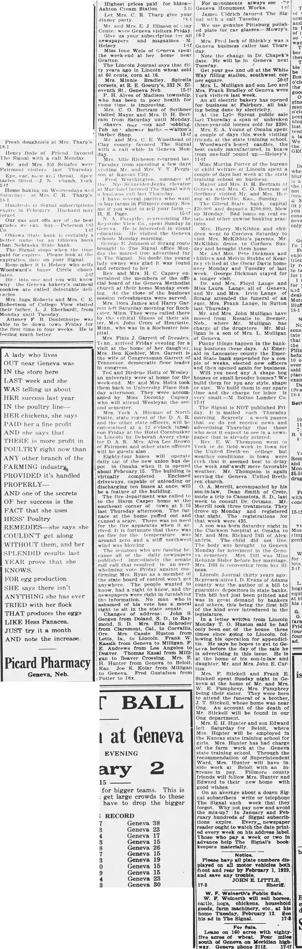 Note the change in Dr. Chapek's date. He will be in Geneva next Tuesday Get your and off at the White Way filling station, southwest cor50-tf square. Mrs. Mulligan and son Leo and Mrs. Frank Bradley Geneva were York visiters last week. all electric bakery has opened for business Fairbury, all baking being done by electricity. Lyle Sprout public sale Thursday span of unbroken horses sold for $390. Mrs. Young of Omaha spent couple days week visiting friends the state school. boxed the best candy boxes from pound Miss Martha Porter of the bureau child welfare Lincoln spent couple days last week the training school business. Mayor and Mrs. H. Bertram Geneva Bertram Scribner visited Mr. and Mrs. Her Belleville, Kas., Sunday The Gilend State bank, capital $20,000 and deposits $200,000. blew Bad loans on real and other unwise banking practices. Mrs. Harry McKibbin and chil dren went Cordova Saturday McKibbin's parents. Mr McKibbin drove Cordova Sunday and brought home Mrs. Pete Dickman and the Oscar home Monday Tuesday of last week George Dickman for longer visit Dr. and Mrs. Floyd Lange and Laura Lange, all Geneva, Mr and Irvin Lange Strang attended the funeral of an aunt Mrs. Frank Lange, in Sutton last Mr. and Mrs John Mulligan have moved from Rosalie Beemer where Mulligan charge of the drugstore Mulligan son of Mrs. L. Mulligan Geneva. Funny things happen in the bankbusiness these days. At Emerin Lancaster county the Emerald State bank suspended for ple weeks, elected officers again for Will you need any shape hog houses brooder houses build them for you any style, shape spare the for labor Bolton Lumber Co. The Signal is NOT published Fri day. mailed each Thursday morning Scarcely week passes not and advertising Thursday that those expect paper that already printed. Thompson went field work in the college but in Iowa were seemed best delay more favorable Mr. Thompson again the Geneva United Brethchurch. Merrill, accompanied by his Dean Smith Crete, made Canastota, last week consult Ortman. Mr. Merrill took three treatments. They drove up Monday and registered that night. The registrations for that week 435 was born Saturday night in hospital Omaha and Mrs. Richard Dill AlexThe child did not live. body was brought to Geneva Monday interment the GeneMrs. Dill was Miss before her Mrs. recovering from her ill Lincoln Journal thirty years ago: Evans Adams county was the author bill guarante in state banks. This bill had just been and in demand by bankers others, this being first bill the kind ever introduced in the letter written from Lincoln Monday Huston said he had only been out the house three times since going Lincoln, fol. lowing his operation for appendicitis. says hopes get to before the sale in this issue. He the home of his and daughter Mr. and Mrs. John CurMrs. F. Stickell and Frank E. Stickell Sunday night at the home of and Mrs. Pumphrey, Mrs. being their They here attend funeral brother, Stickell, home was Ong. An account the death of Mr. Stickell will be found in our Ong department. Mrs. Hunter and son Saturday for Reloit, where Hunter will be employed in the Kansas state training school for Mrs. Hunter has had charge of the farm work the Geneva state training school. Through the of Ward, Mrs. will have Beloit an crease Fillmore county friends will follow Mrs. Hunter and Edward to their new home with good wishes. On an average about dozen Sig subscribers write or telephone The Signal each week that they forgot. not pay avoid the In January and Feb ruary hundreds Signal subscrib tions expire. Every_ newspaper reader ought to watch the date ed every week on his address label. Those week two in advance help Signal's keepers